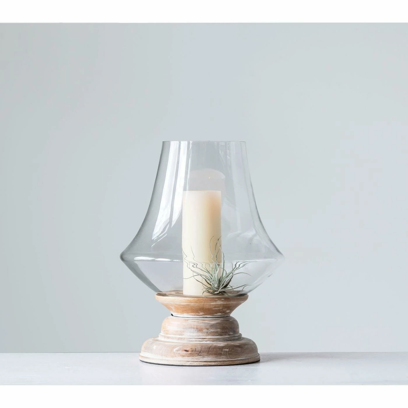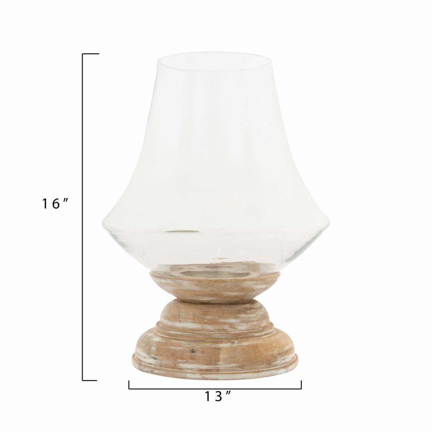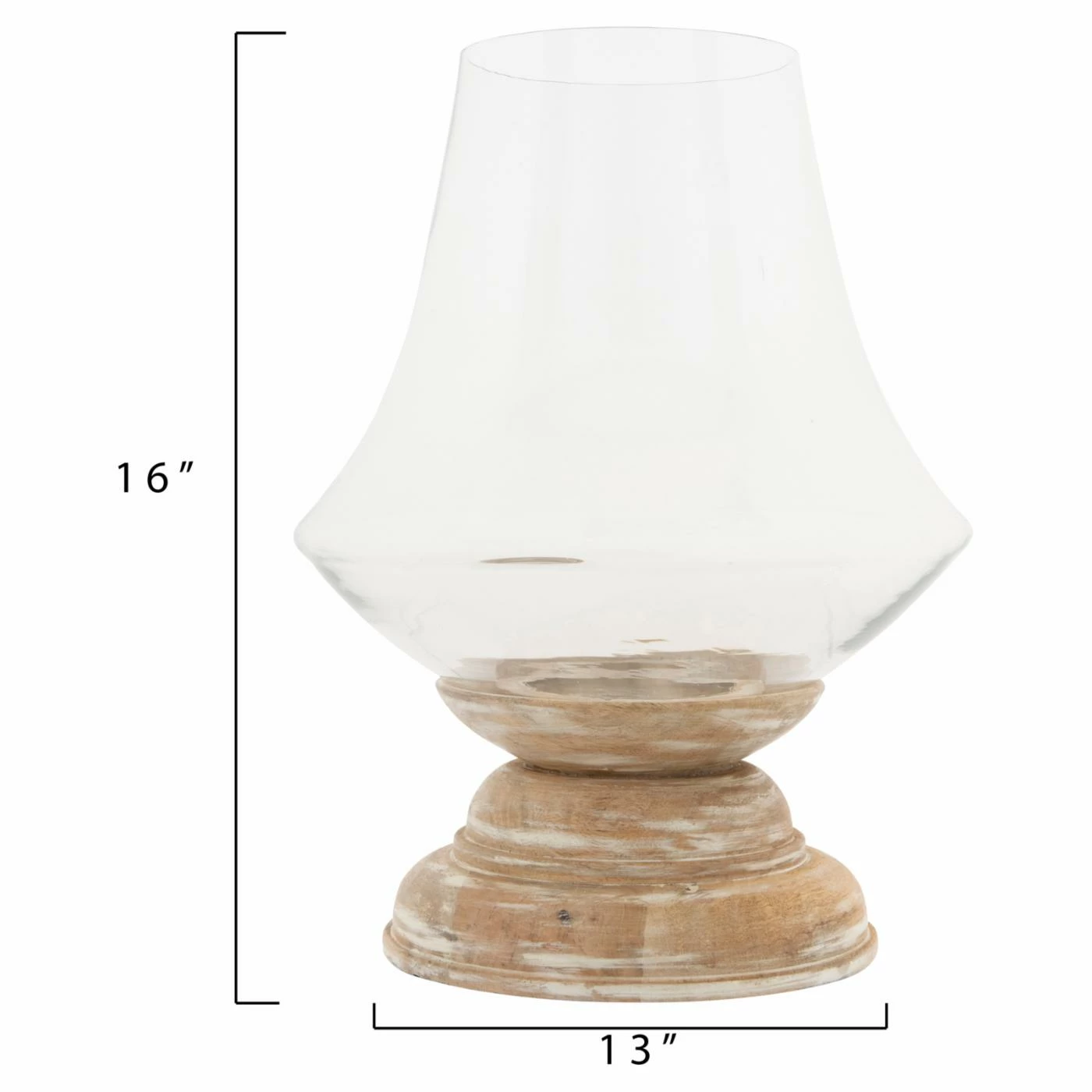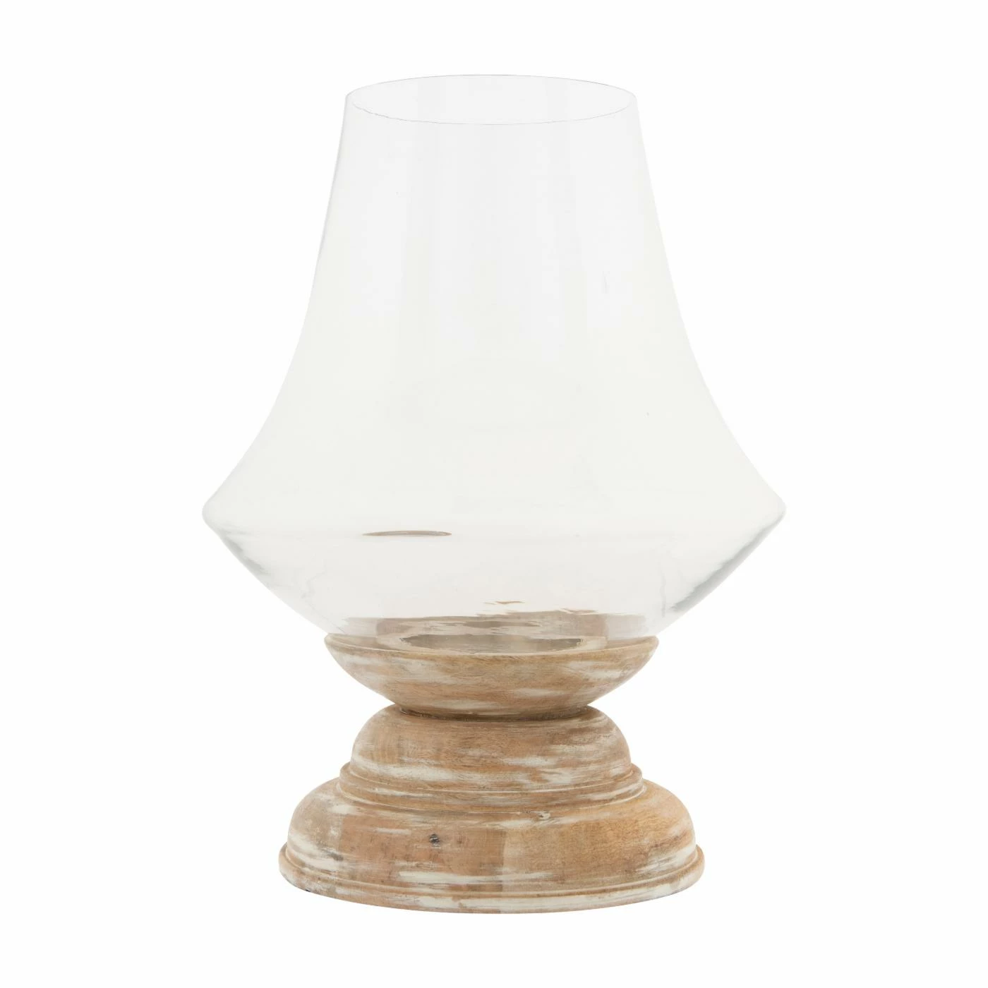 With its blend of finishes and textures, the 3R Studios Whitewashed Mango Wood Hurricane Candle Holder with Clear Handblown Glass is replete with rustic appeal. This candle holder features a mango wood base that sports a becoming whitewashed finish. Its hand-blown clear glass hurricane catches and refracts light for a fetching effect.