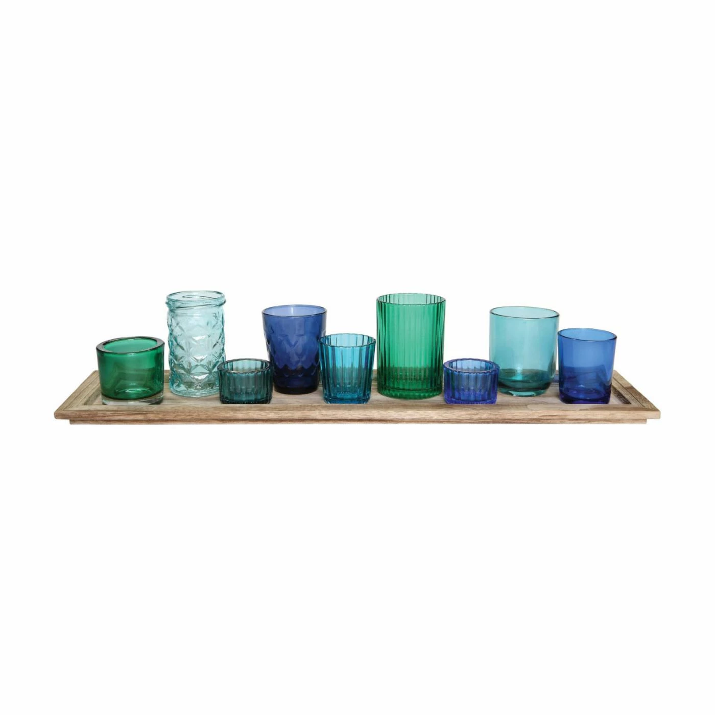 Evoking the calming vibes of the ocean, the 3R Studios Wood Tray with 9 Blue and Green Glass Votive Holders features an assortment of nine votive holders made of glass in blue and green hues and a variety of textures and sizes. This unique set includes a sturdy brown wood tray to help you create a warm illumination on a mantelpiece, table, or shelf.