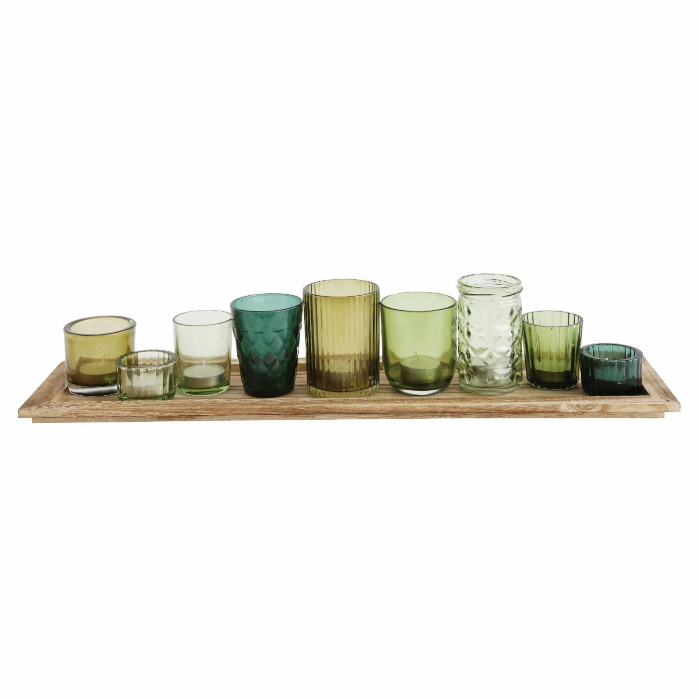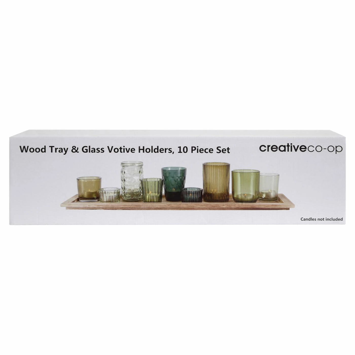 The 3R Studios Wood Tray with 9 Green Glass Votive Holders adds a fun element to your dΓ©cor with a sturdy wooden tray cradling nine glass votive candle holders. This eclectic set boasts a variety of sizes and textures along with varying shades of green to bring your home an earthy illumination.