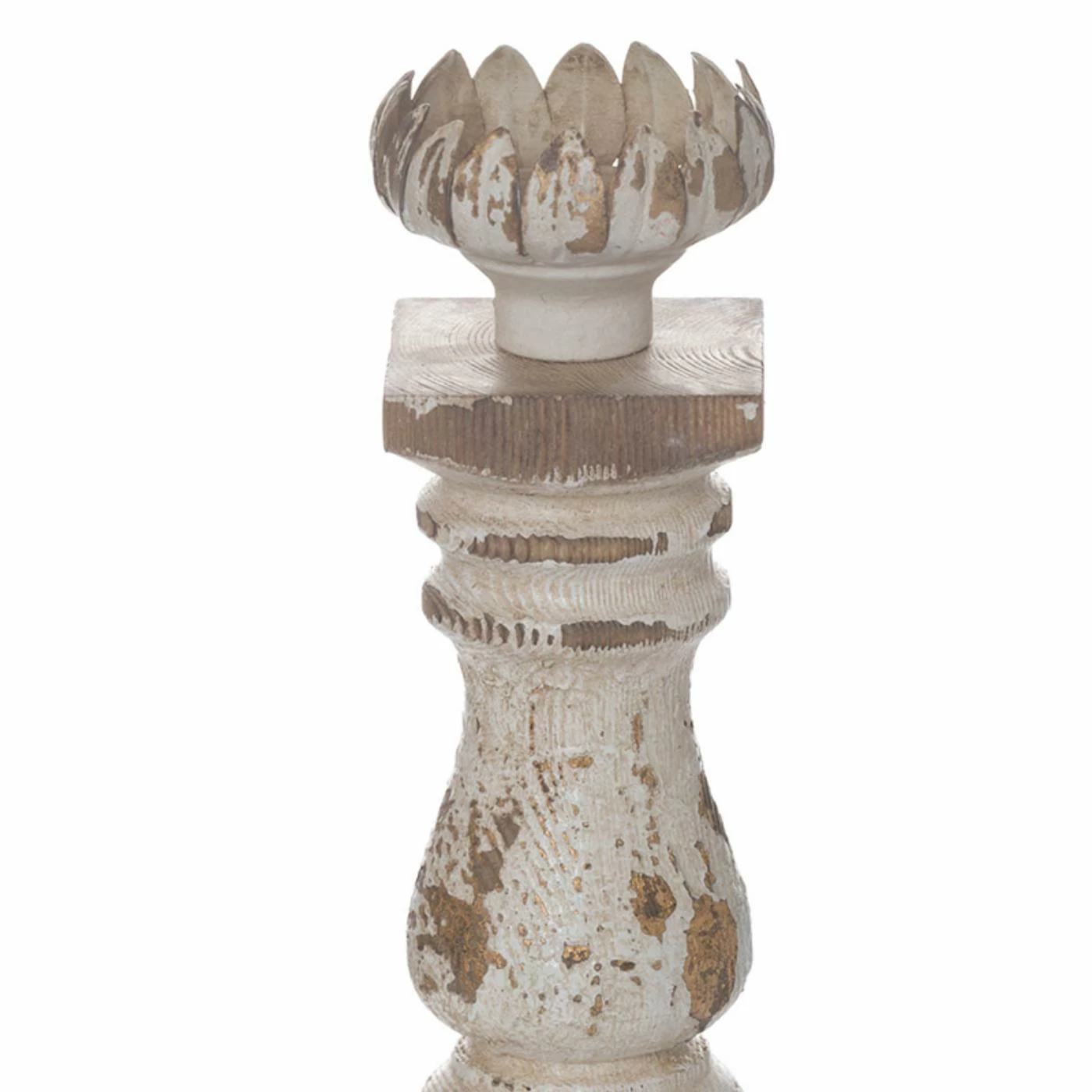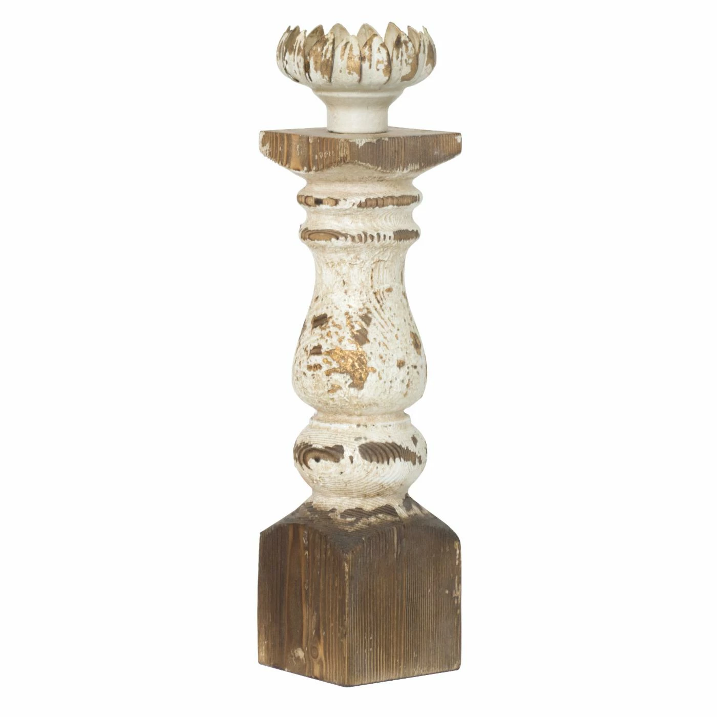 Flaunting a heavily distressed white and natural brown finish, the AB Home Bellamy Candle Stick will add a timeworn touch to your dining table, console, mantel, or shelf. The solid fir wood candlestick features an iron bobeche sized to accommodate a four-inch pillar candle.