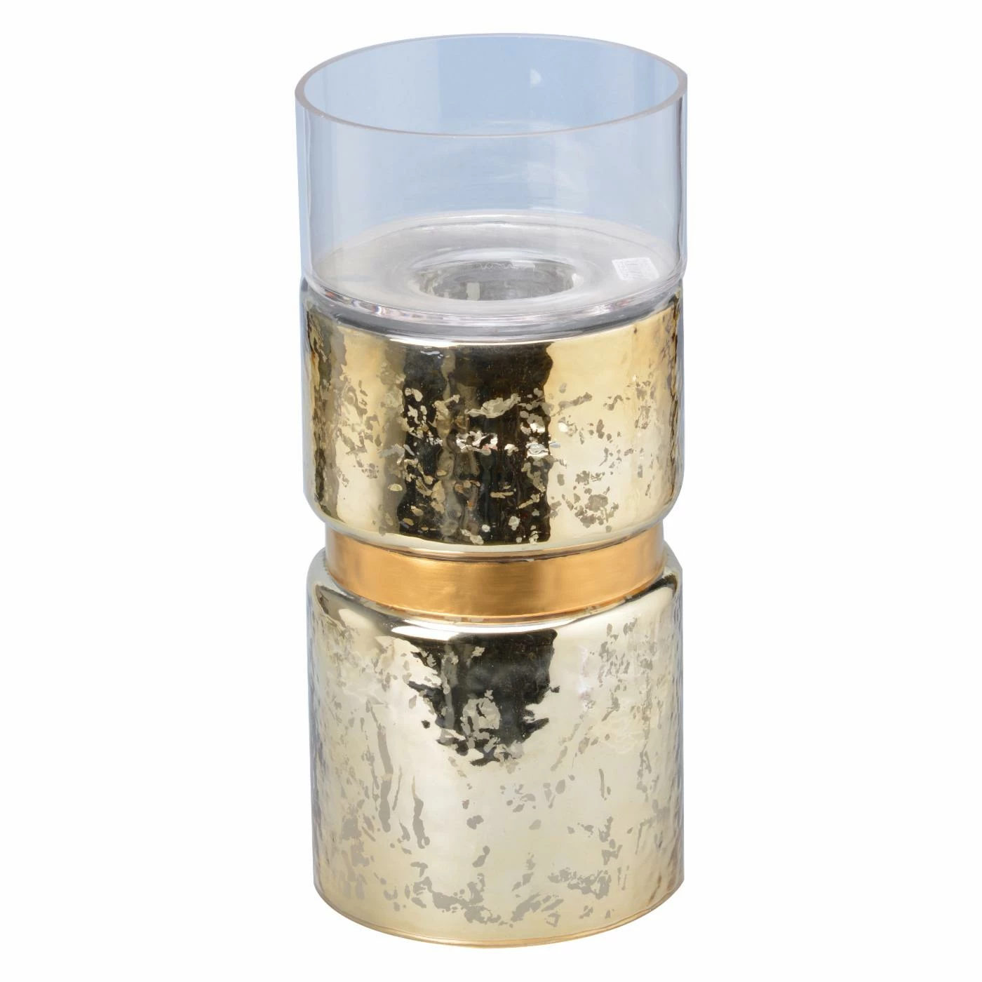 Bring dramatic style to the table with the A and B Home Halloway Candleholder, boasting a thick base made of glass in your choice of available finish and size with a center band and speckled texture. This unique candleholder includes a clear glass cup on top that’s perfect for your chosen pillar or votive.