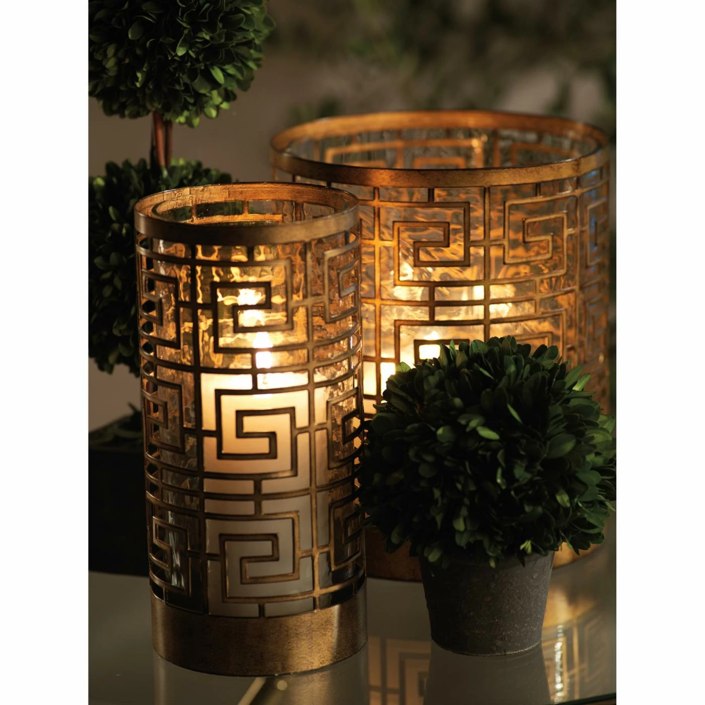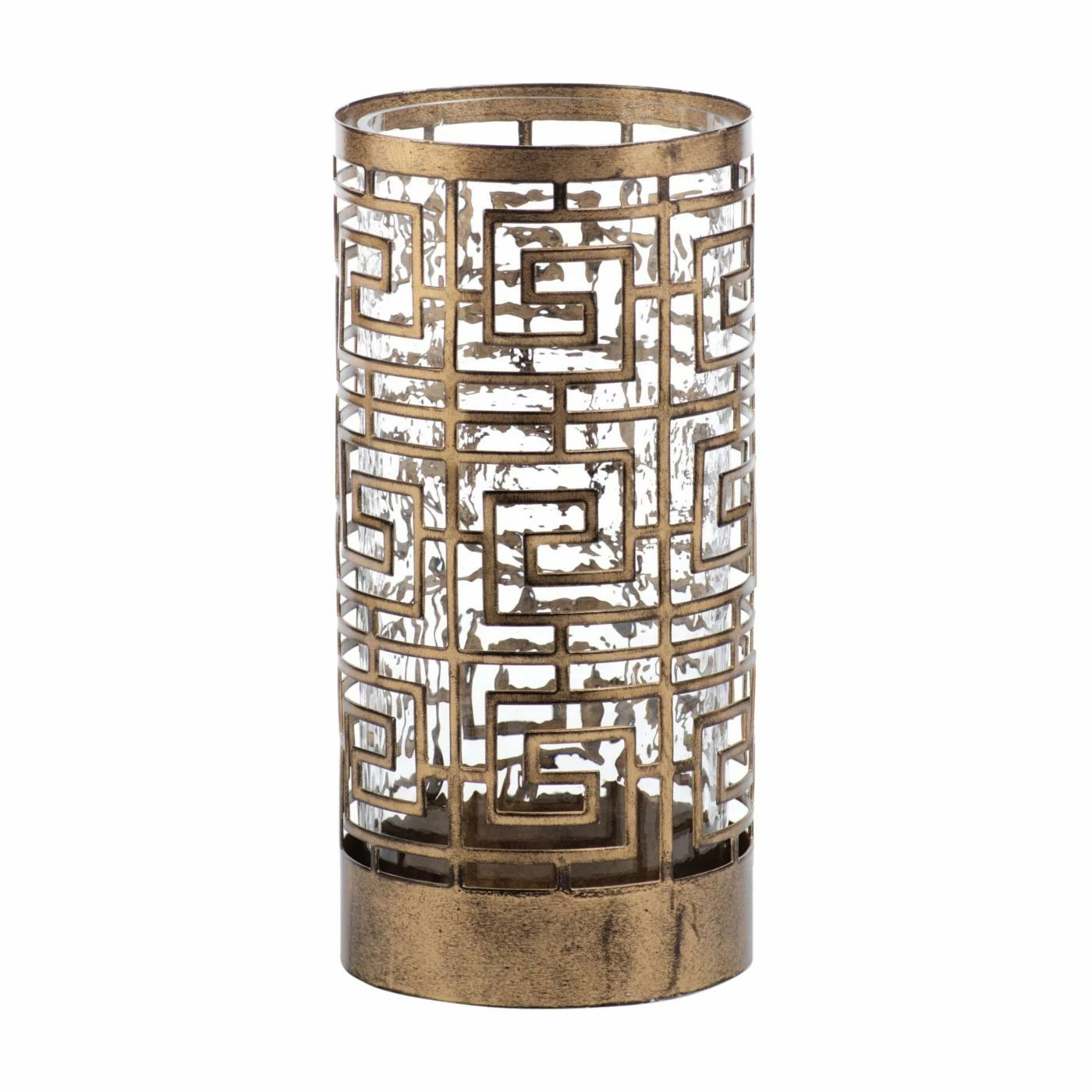 Protect your candle and countertops with the Mondre Hurricane Candle Holder. This candle holder has a hurricane style design with a cylindrical inner layer made from rain glass. The outer layer is made from iron with a squared die-cut spiral design. An antique bronze finish complements the design.