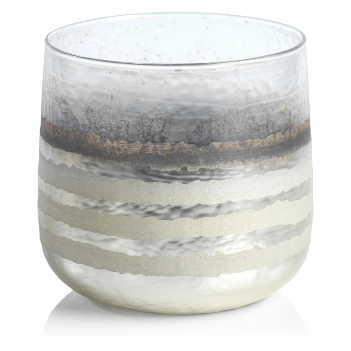 Add a warm feeling and added glow to your living space with the Off-White Smoke Candle Hurricane. This candle holder is crafted from glass with an off-white and smoky-gray finish with wavy rings to complete the rustic look. Combine all the available sizes to complete the look.