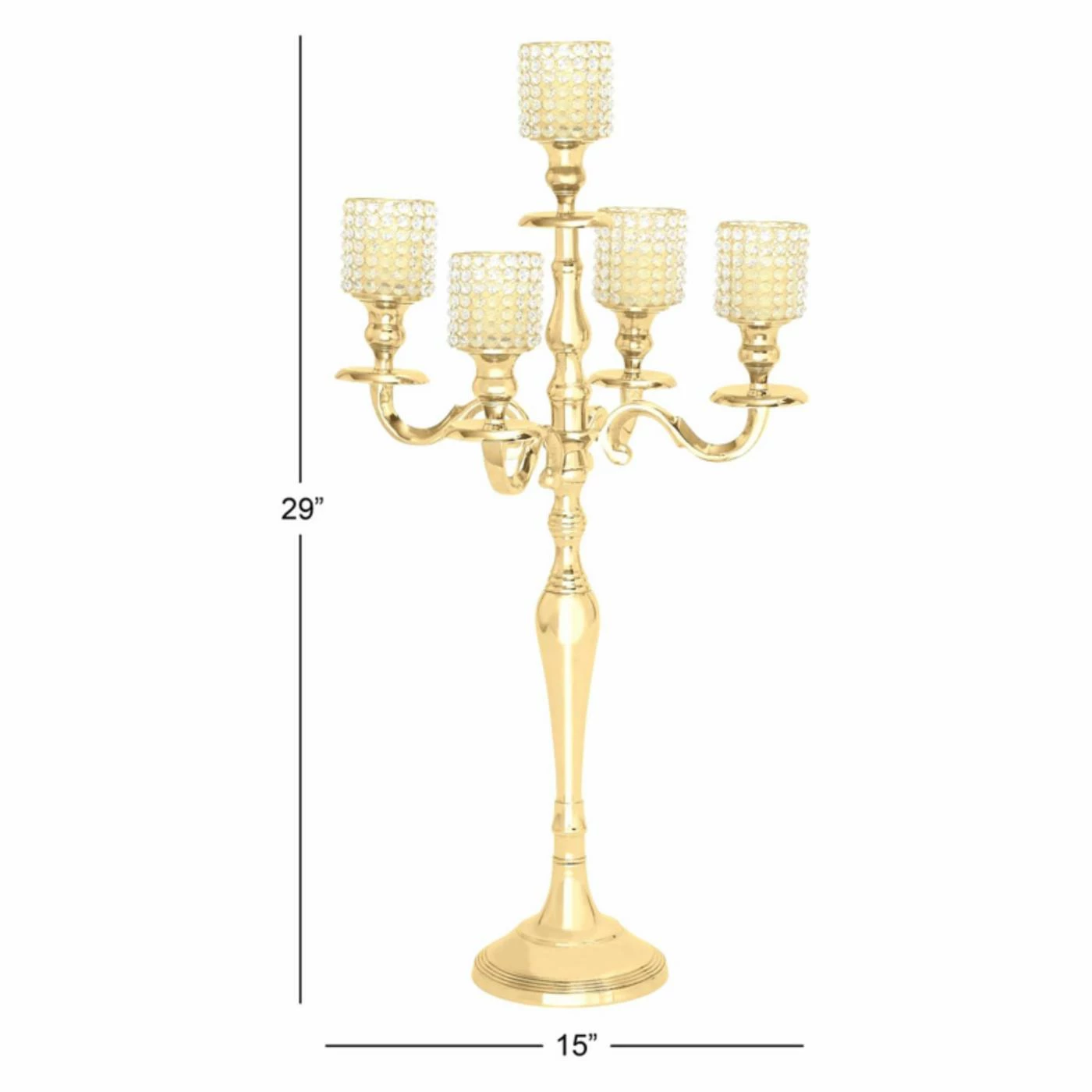 Make your tablescape sparkle with the DecMode 29-in. Aluminum Acrylic Candelabra. The five posts on the tarnish-proof aluminum candelabra are capped with wire shades studded with acrylic gems. Under the glow of candlelight, the acrylic stones glitter, and the shades keep the flames of the votive candles enclosed for safety.