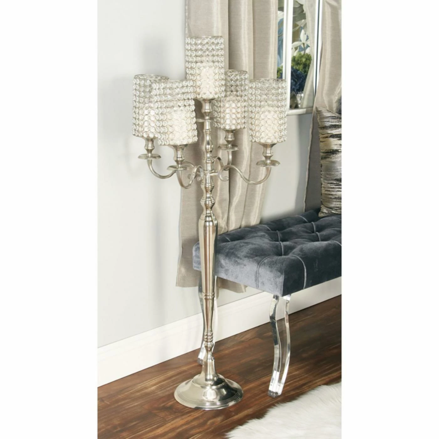 Enjoy dining by candlelight without worries about open flames with the DecMode 45-in. Aluminum Acrylic Candelabra. Its design pairs a traditional five-candle design with acrylic, jeweled-wire frames that enclose your votives to ensure safety. Aluminum construction keeps the candelabra free of tarnish.