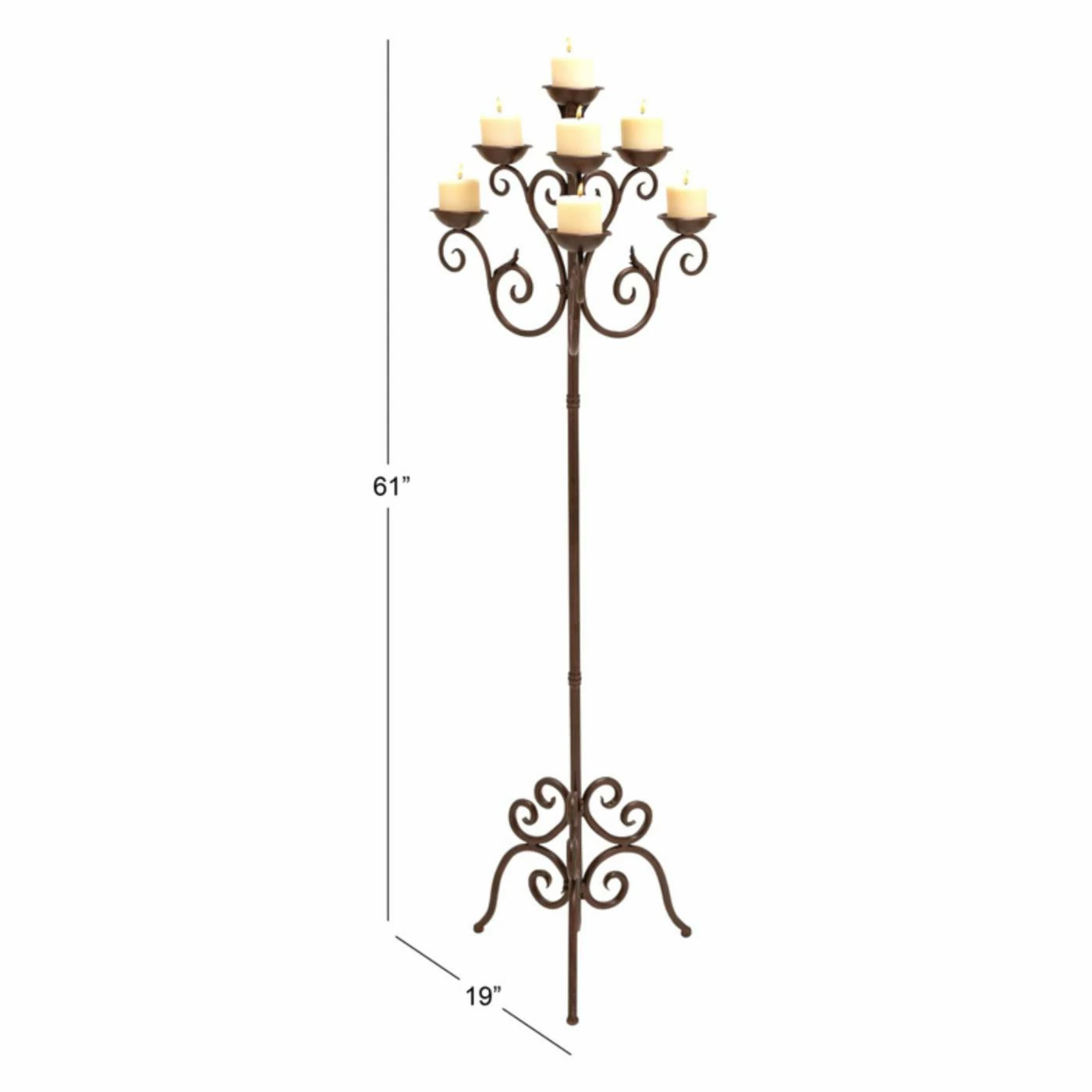 Fill in an empty space in your floor plan with the DecMode 61-in. Metal Candelabra and add some old-world appeal to your living space. Finished in warm brown, the iron candle holder features eight scrollwork arms and a center post to hold a total of nine votive or small pillar candles. A scroll-capped tripod base keeps it stable.