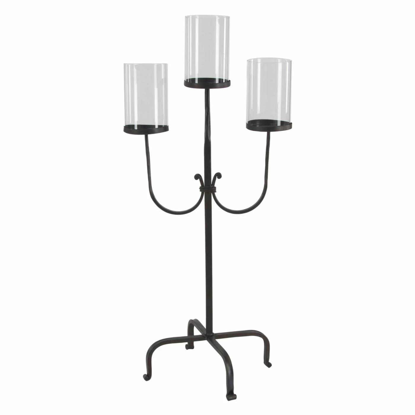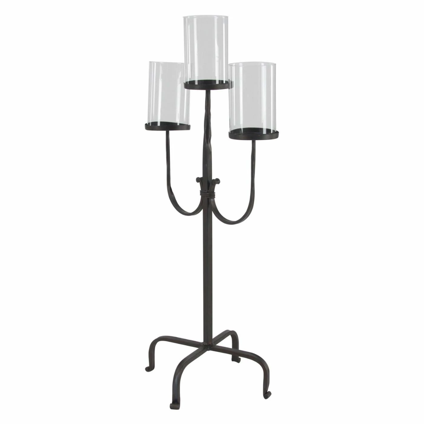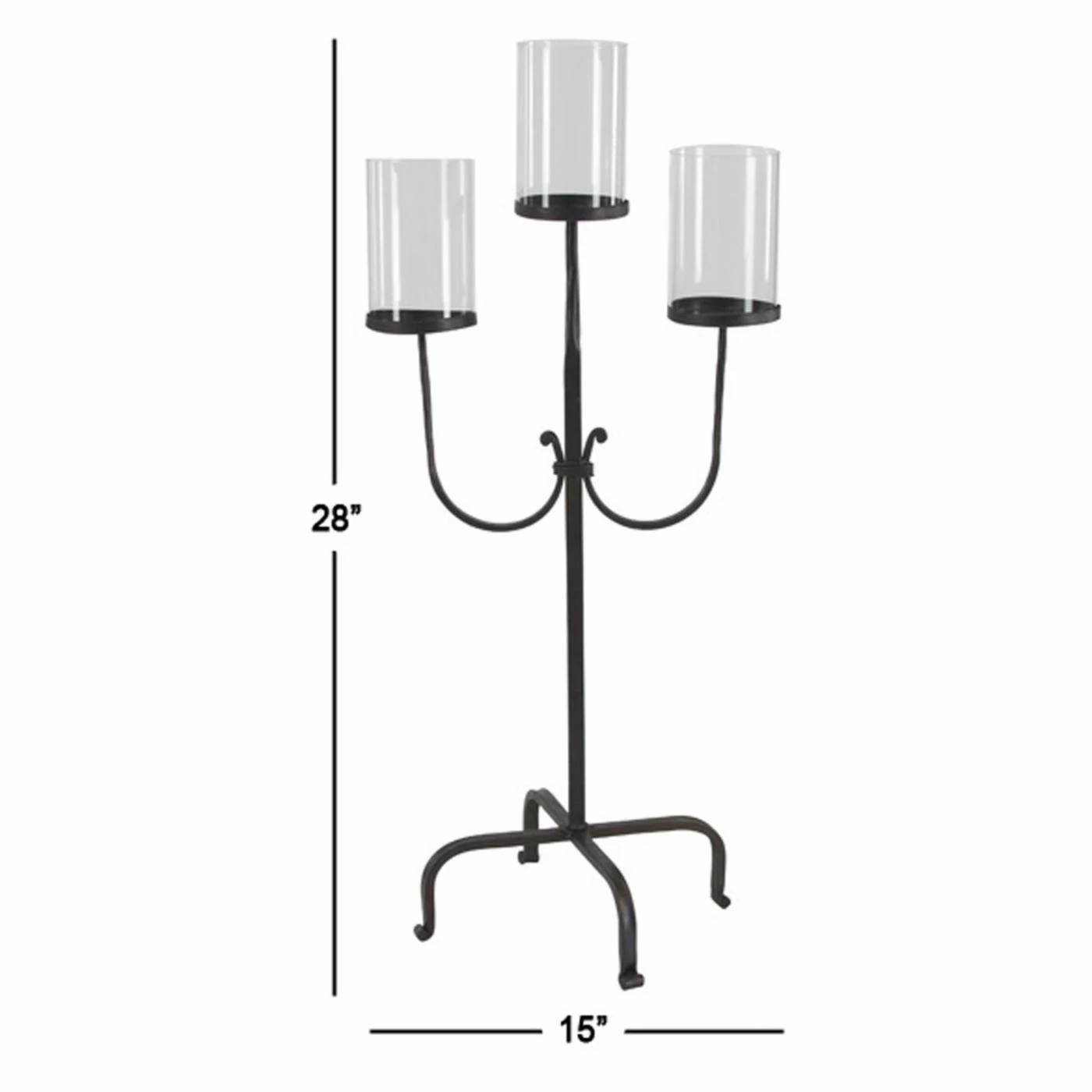 At over two feet tall, the DecMode Traditional Black Iron and Glass Three-Light Candle Holder makes an impressive display. Style this three-light candle holder on your entryway console or dining buffet. Each clear glass hurricane shade accommodates a pillar or ball candle. The simple black iron base works with a variety of interior designs.