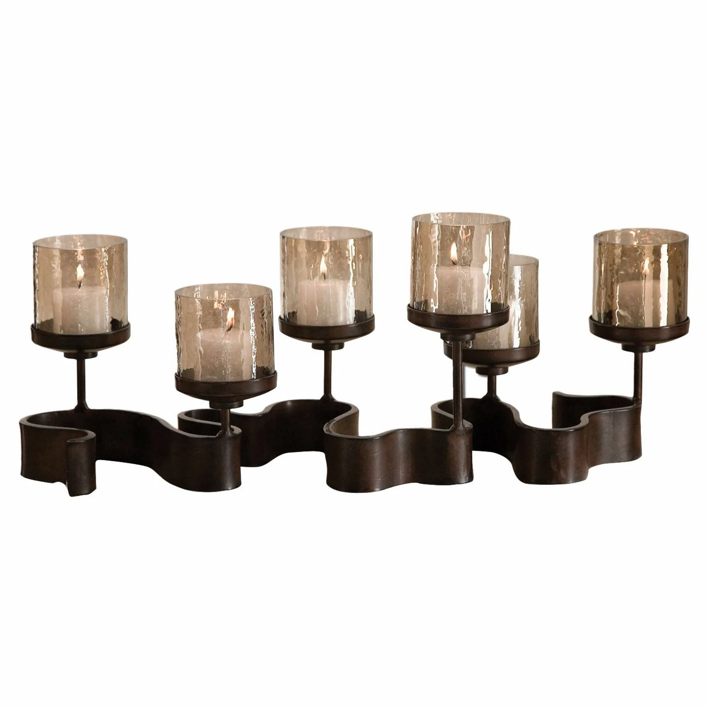 Elegant and fun, the Uttermost Ribbon Candelabra adds style, flair, and ambience to your coffee or end table. Bonus points for having a candelabra in the first place, this multiple candleholder features a carved leaf design in a rustic bronze finish with amber luster glass globes protecting the flames.