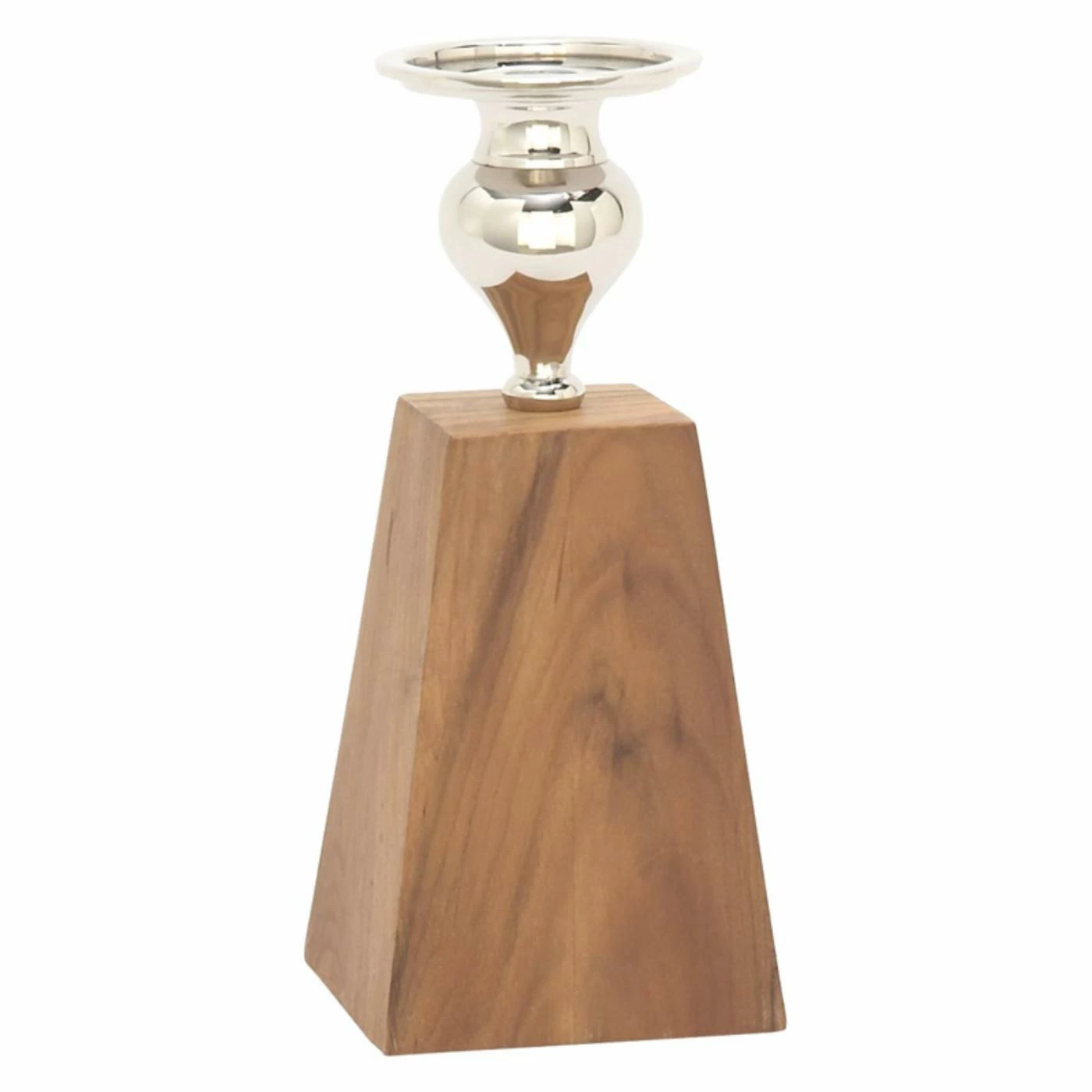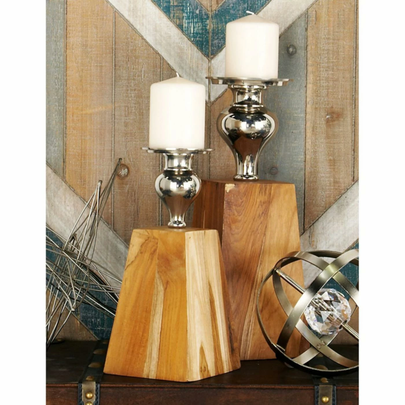 Thanks to a bold design, the DecMode Teak Wood Candle Holder adds visual interest to a table or shelf with a large trapezoid base made of teak wood in a natural finish. This head-turning candle holder has a sleek rounded silver holder on top for a burst of modern shine. Choose your preferred size and add a pillar candle to create a graceful aura in your favorite space.
