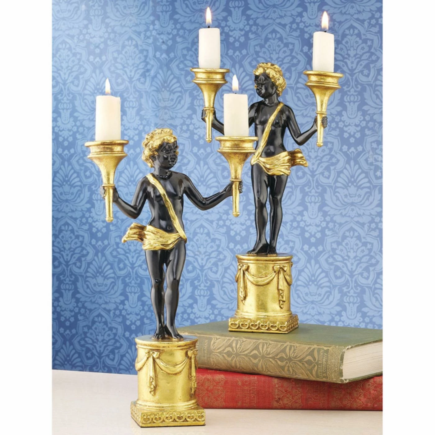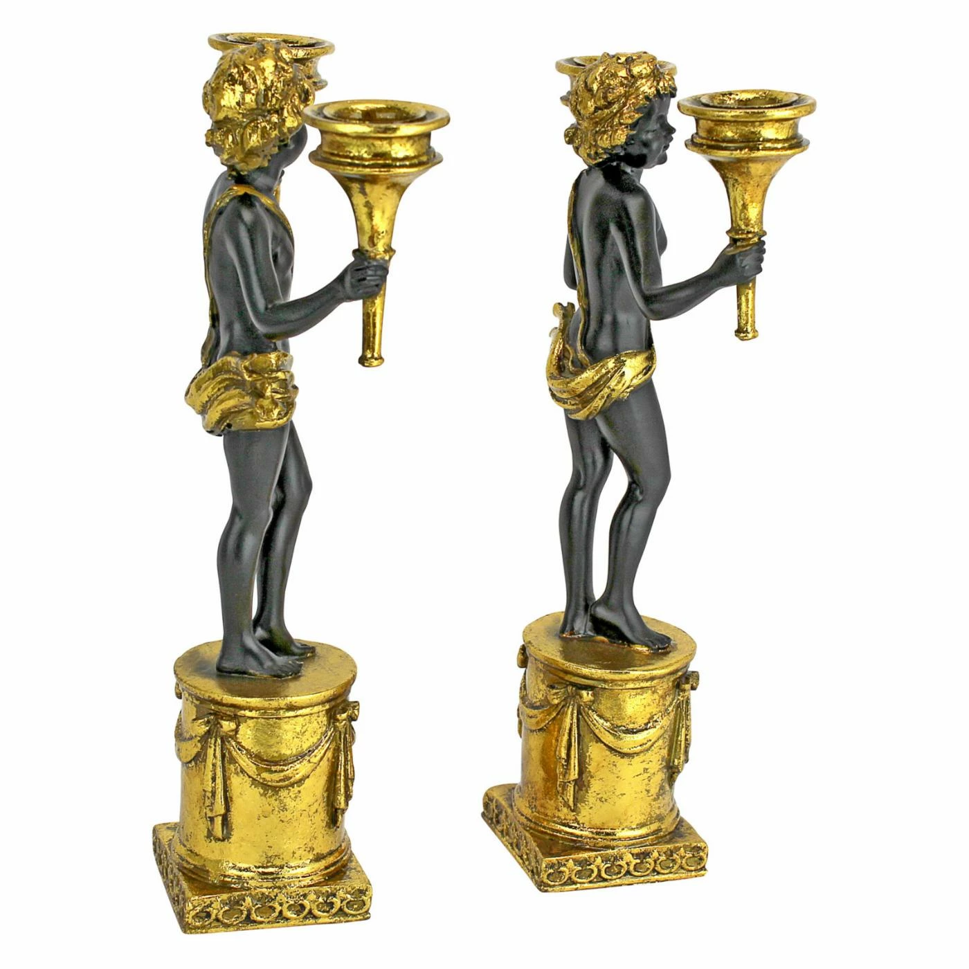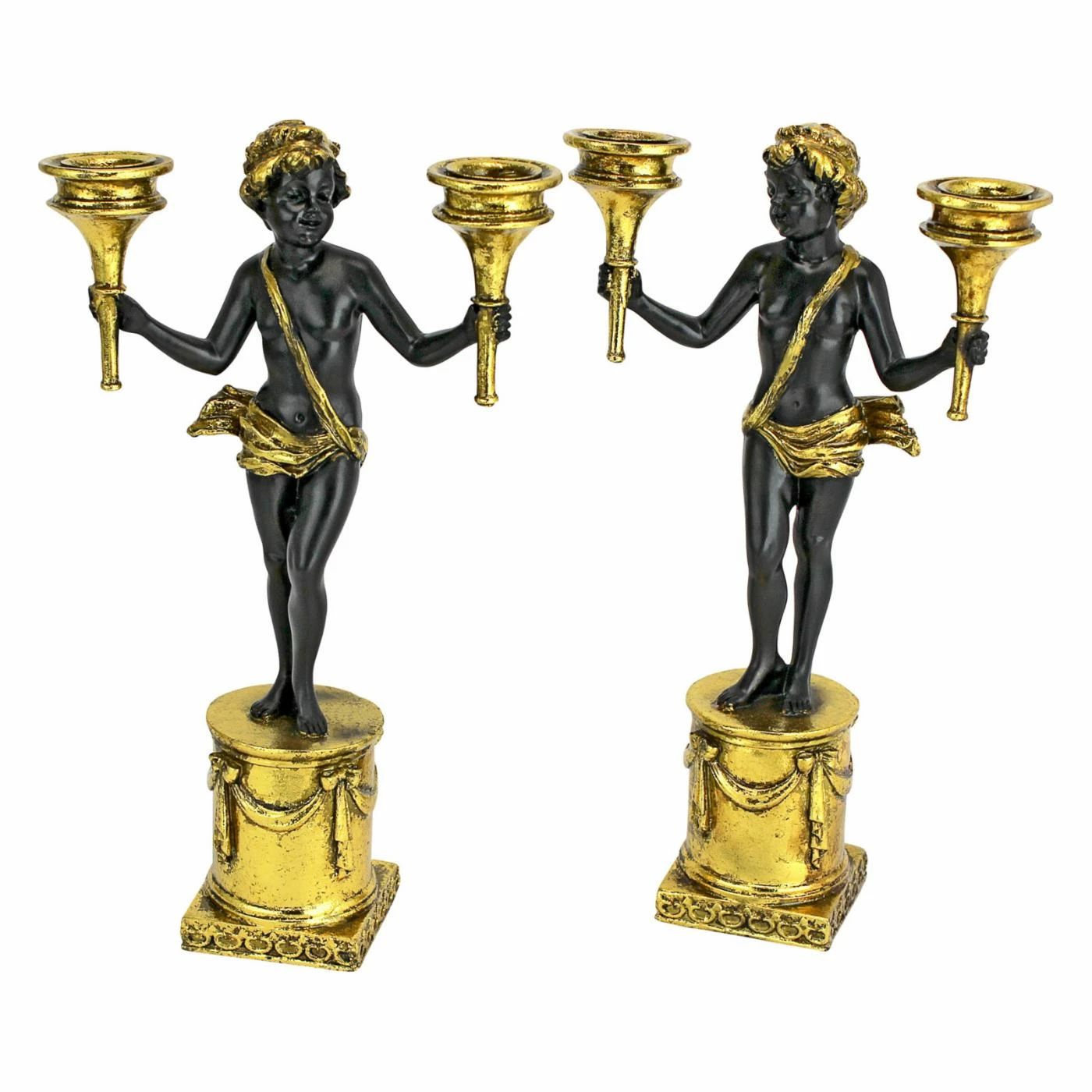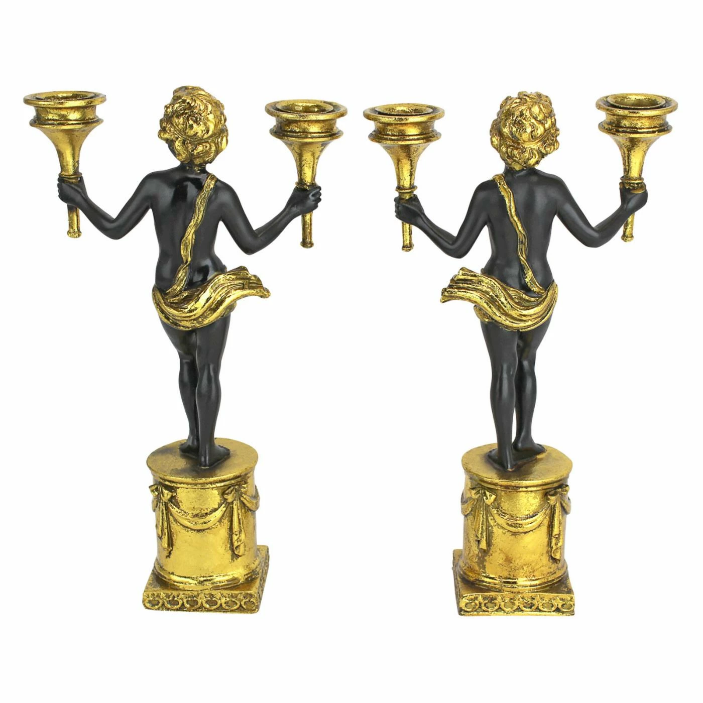 The Design Toscano French Neoclassical Cherub Candlestick – Set of 2 enchants with each angelic statue holding a torch candle in each hand. Each candlestick is crafted of designer resin that has the look of sleek porcelain with a black glaze and shimmering gold finish.