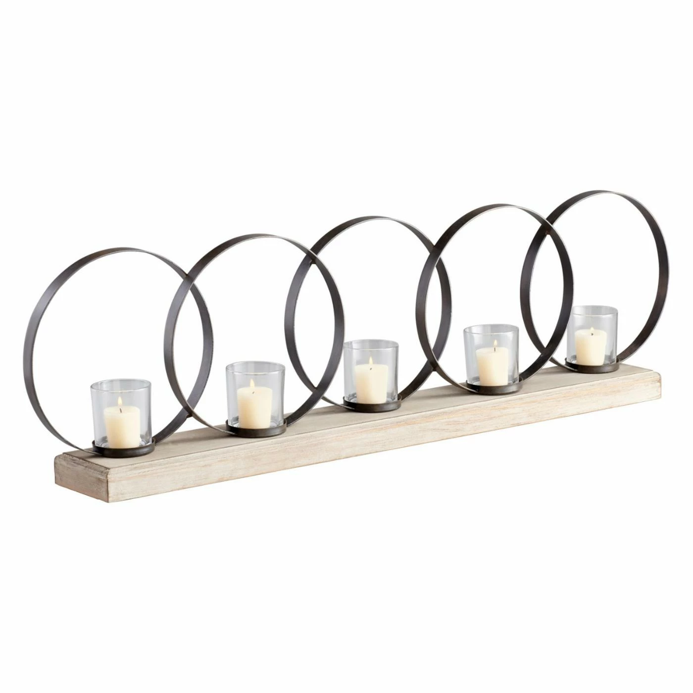 Five overlapping circles enhance the geometric elegance of the Cyan Design Ohhh 5-Candle Candleholder. This long candleholder boasts a natural wood finish and raw metal. Place five of your favorite candles inside the glass shades to complete the look.