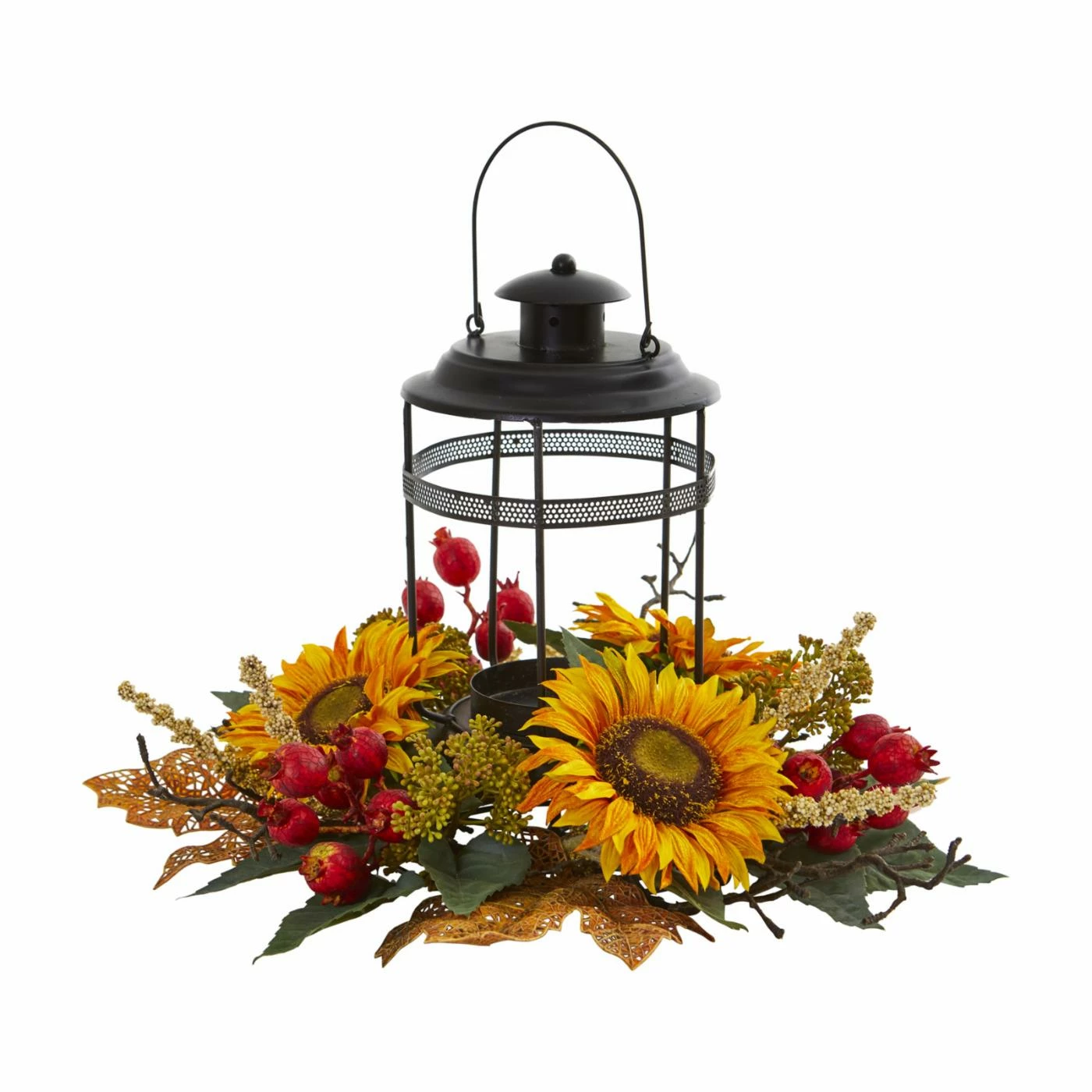 The Nearly Natural Sunflower Berry Artificial Arrangement Candelabrum lends a cheerful, vibrant look to your table with a combination of vivid colors. Place this artificial arrangement candelabrum in any room and enjoy the sweet combination of sunflowers, foliage, and red berries, along with a metal lantern-style candleholder.
