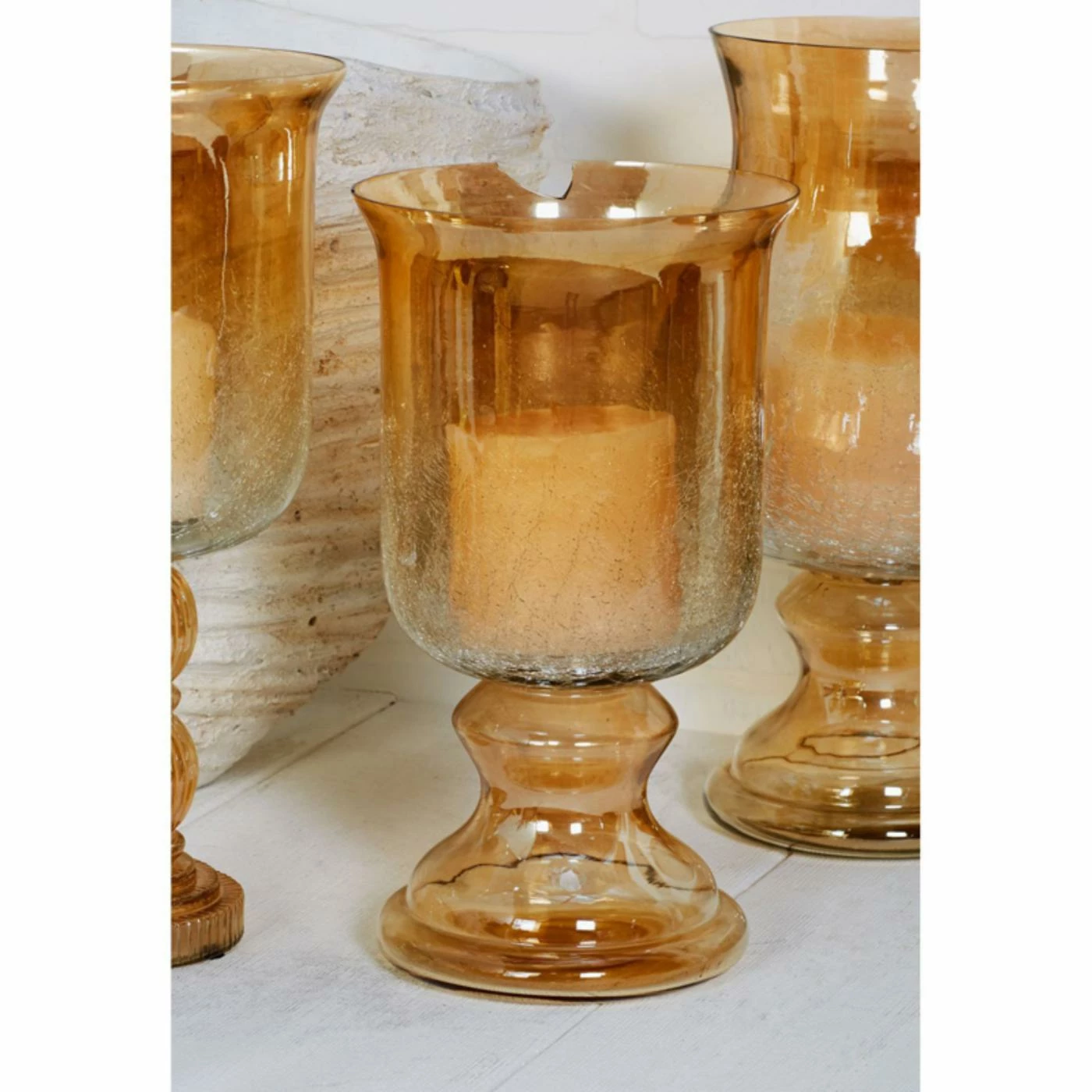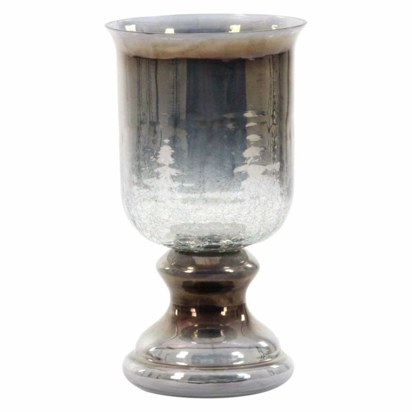 With its crackled, frosted hurricane shade, the DecMode 14-in. Hurricane Lamp Candle Holder produces an attractive glowing effect when filled with a lit votive. The candle holder is crafted out of sleek glass in your choice of available colors.