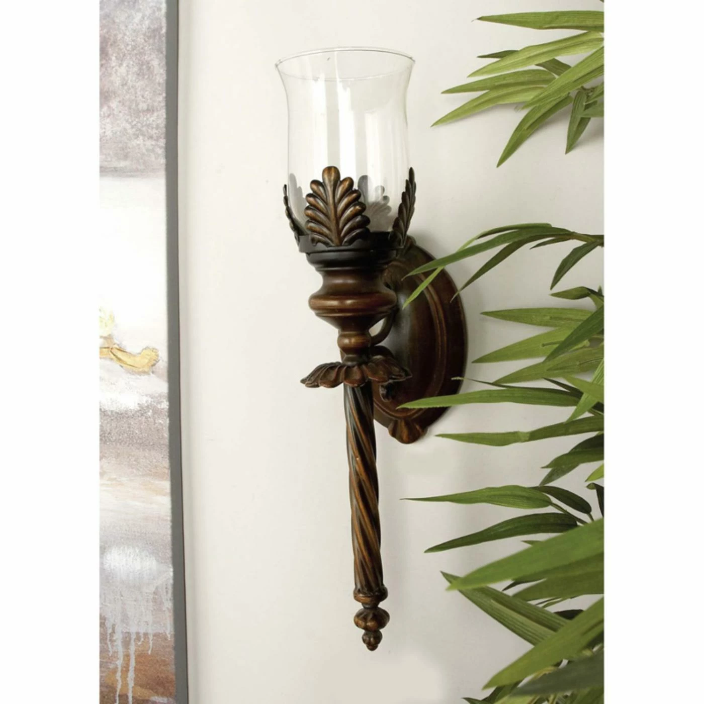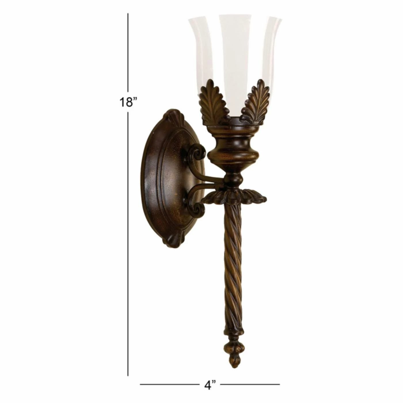 The DecMode 18 in. Metal Candle Wall Sconce – Bronze features elements of nature with sculpted leaf-shaped accents that surround the clear glass shade. A twisted base brings this gorgeous bronze-finished sconce a whimsical look that enhances a hallway, dining room, or any living area you want to add an elegant touch.