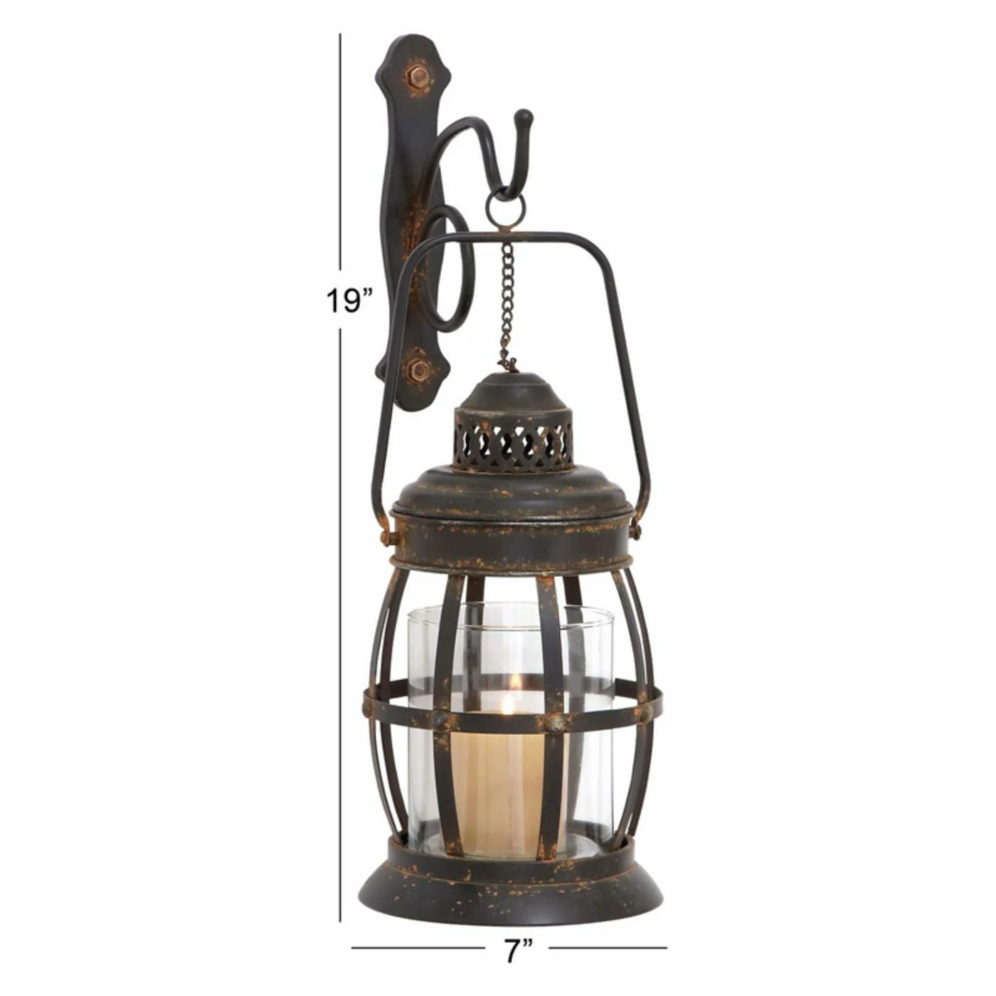 The DecMode 19 in. Metal Wall Sconce reminds you of an old railroad station light thanks to a rustic deep bronze finish and classic design. The iron wall mount holds a bold caged glass shade so you can add a flickering candle and create a soft, warm glow in any room of your home.