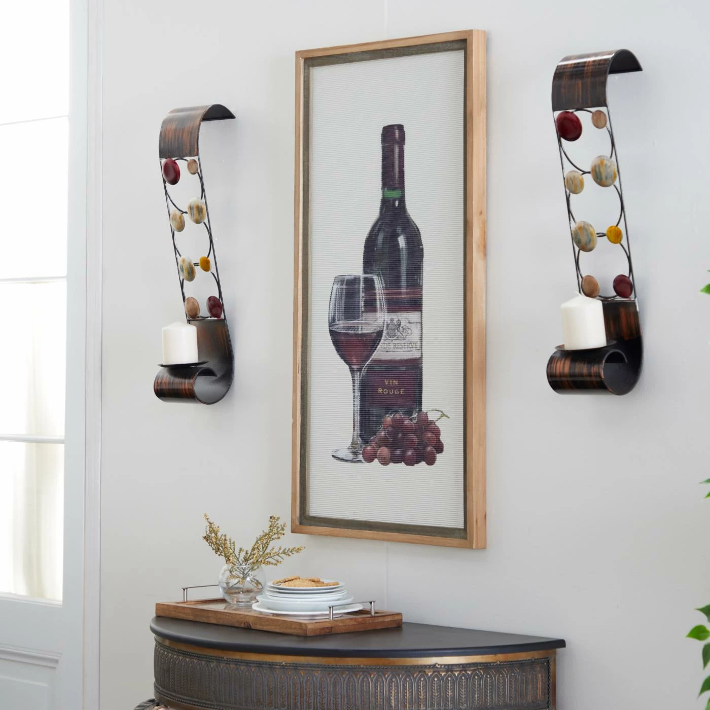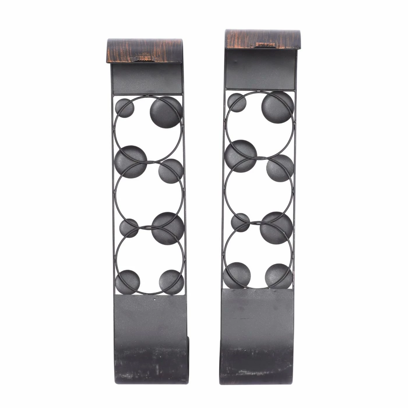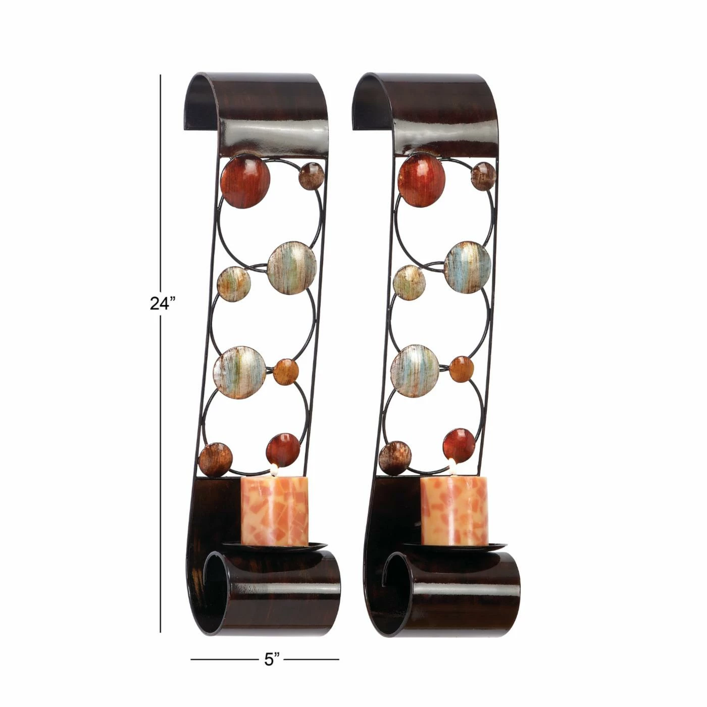 The DecMode 24 in. Candle Wall Sconce – Set of 2 brings modern whimsy to your walls with its truly fun design. These contemporary sconces are crafted of bronze-finished iron accented with circles in a variety of colors. Round candle cups nest at the bottom to help you add a pleasant, flickering light to the room whenever you desire.