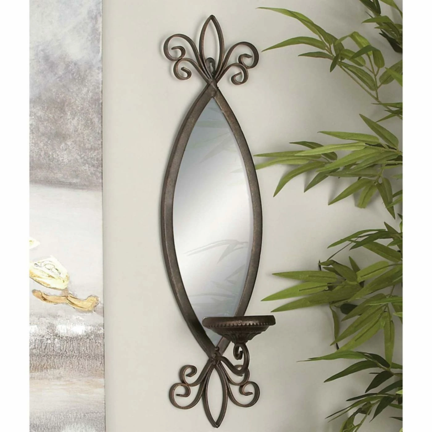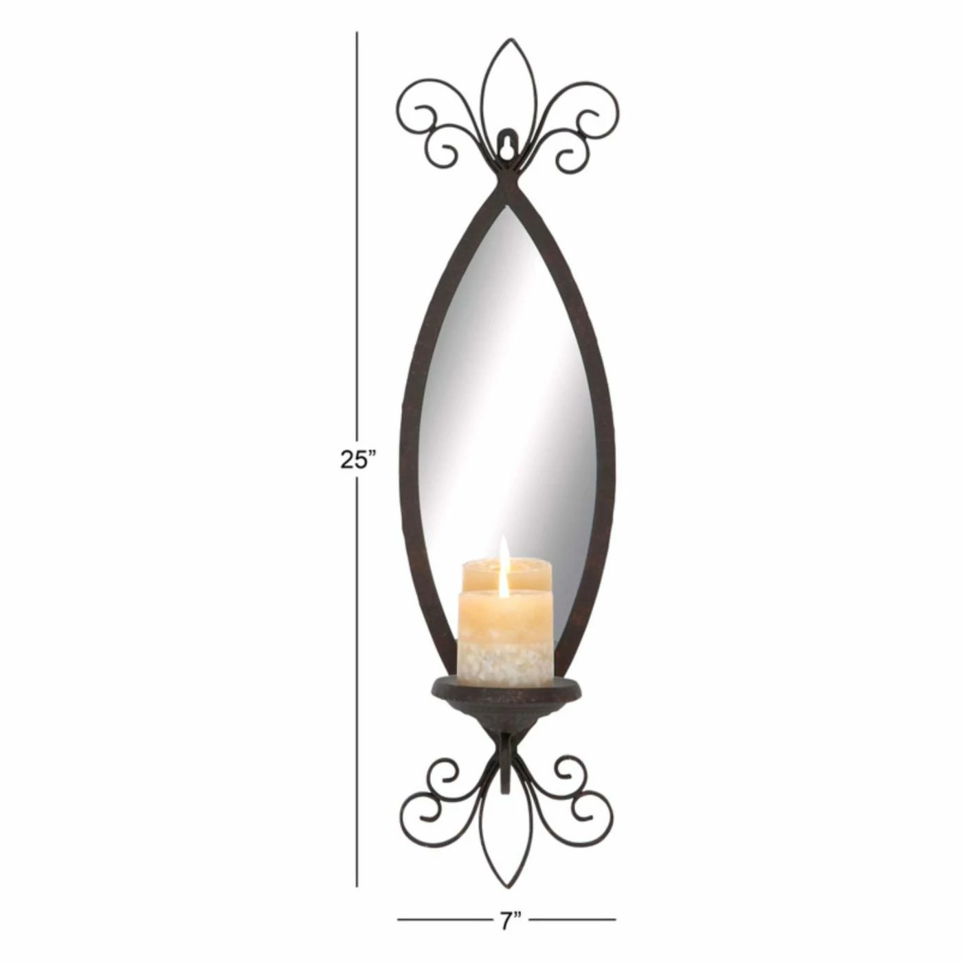 The DecMode 25 in. Metal Mirror Candle Wall Sconce will add light and reflection to any room of your home thanks to an oval-shaped mirror surrounded by a bronze-finished iron scrollwork frame. Place a candle in the tiered cup to help it give off a brilliant glow.