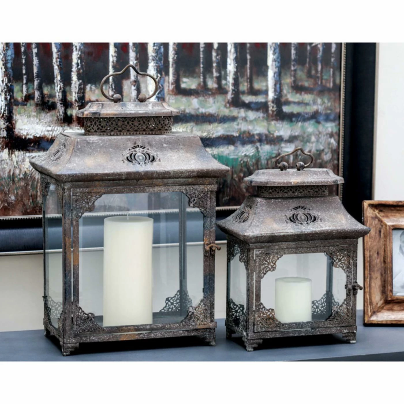 Beautifully aged and distressed, the DecMode 52915 Lantern Candle Holder – Set of 2 brings antique appeal to your decor. Featuring mansard design tops and intricately cut embellishments, this glass and metal set offers an elegant home to your favorite candles.