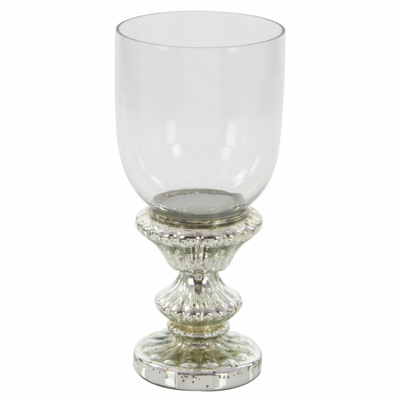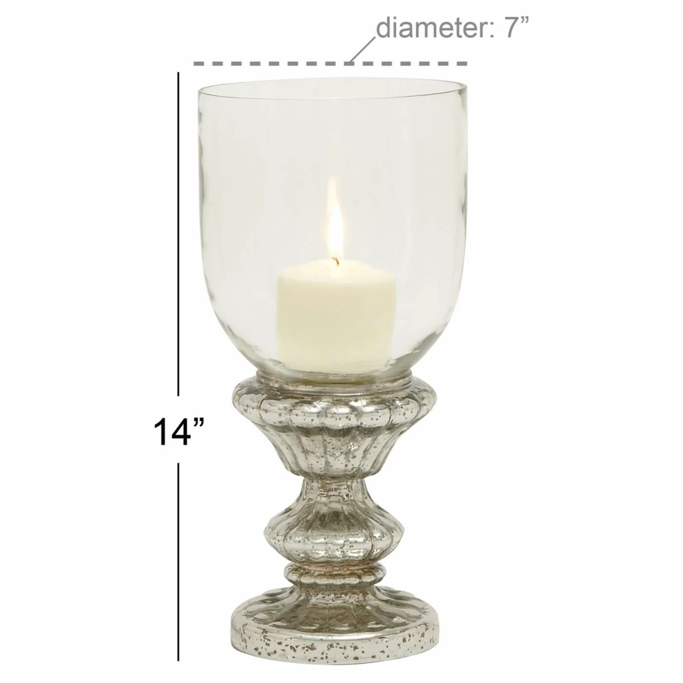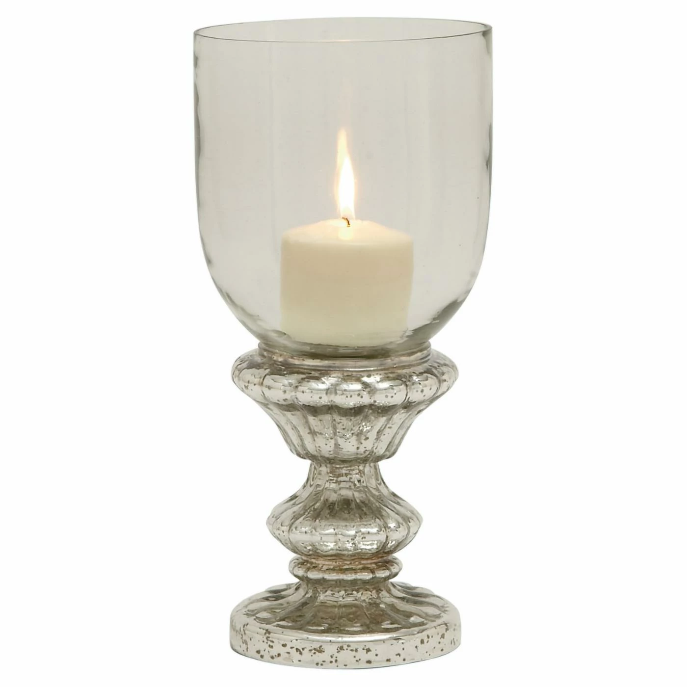 A fluted silver mercury glass base gives the DecMode Cup Hurricane Candle Holder its antique appeal. A clear hurricane glass shade enhances the aesthetic and protects the candle flame from every passing breeze. Use this candle holder for pillar or ball style candles.