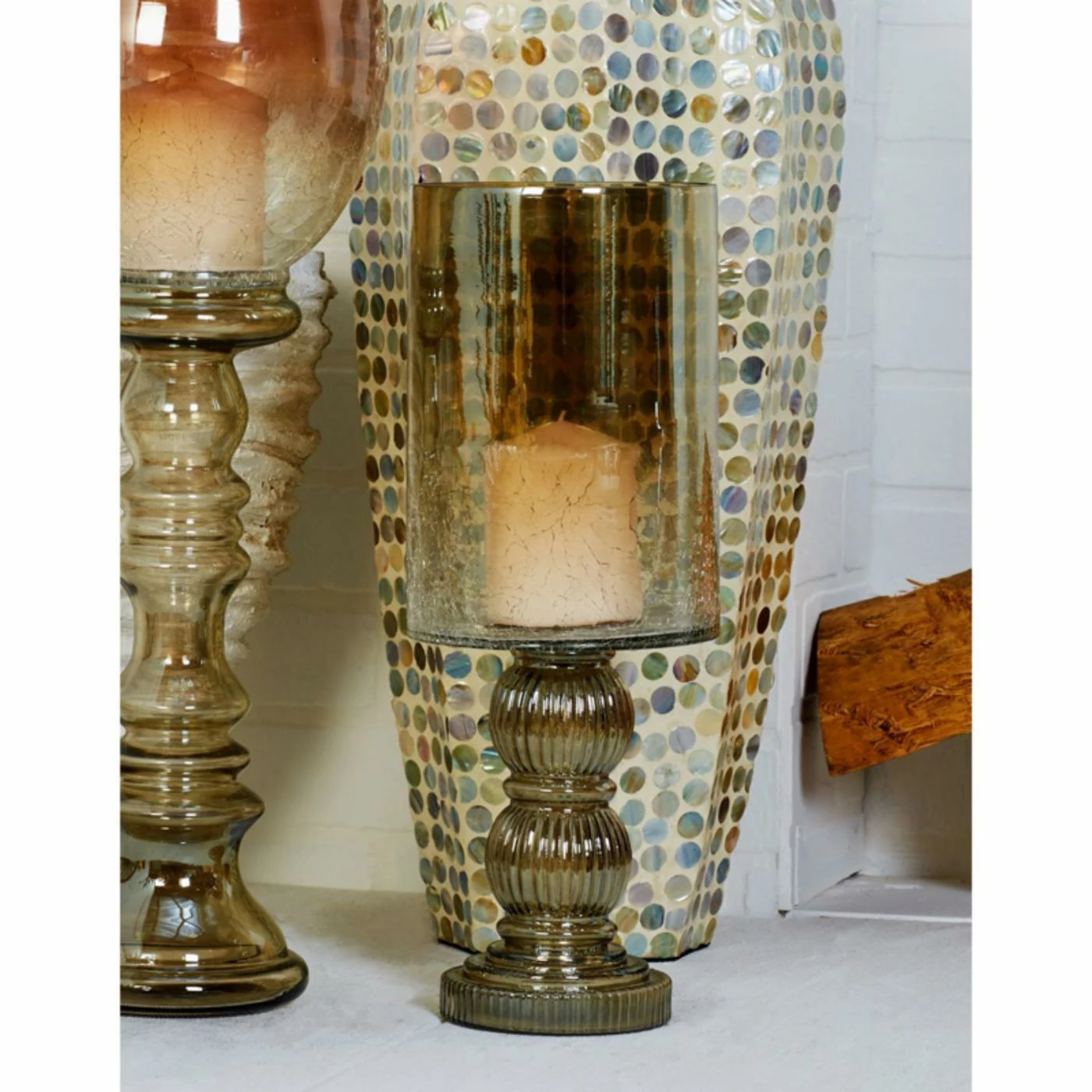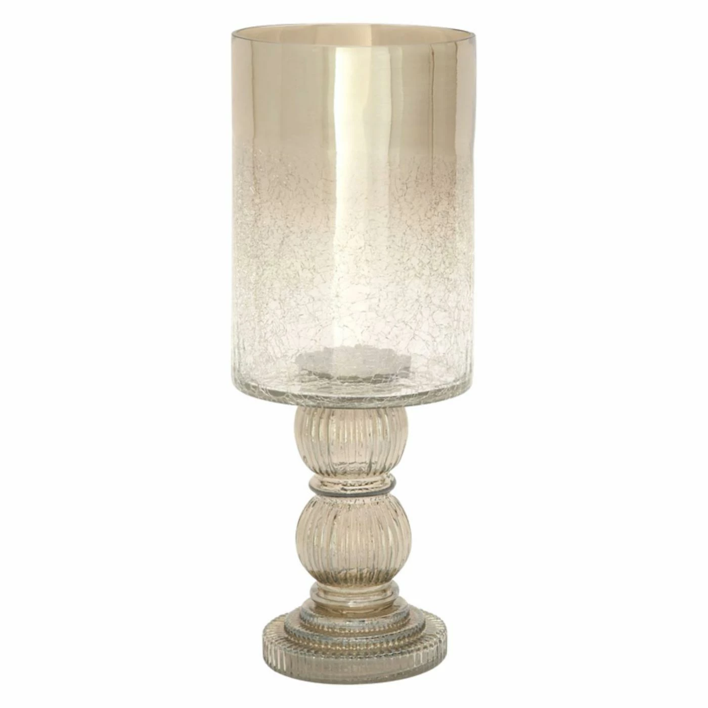 Inspired by antique glassware, the DecMode Glass Hurricane Candle Holder with Round Base features a cylindrical shade with a frosted, crackled finish in your choice of available tint. A fluted chalice base supports the hurricane, which is perfectly sized for a standard votive.
