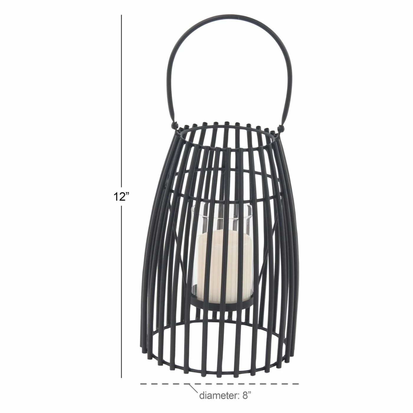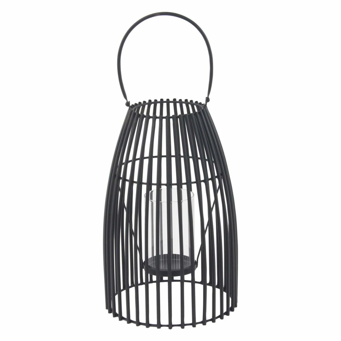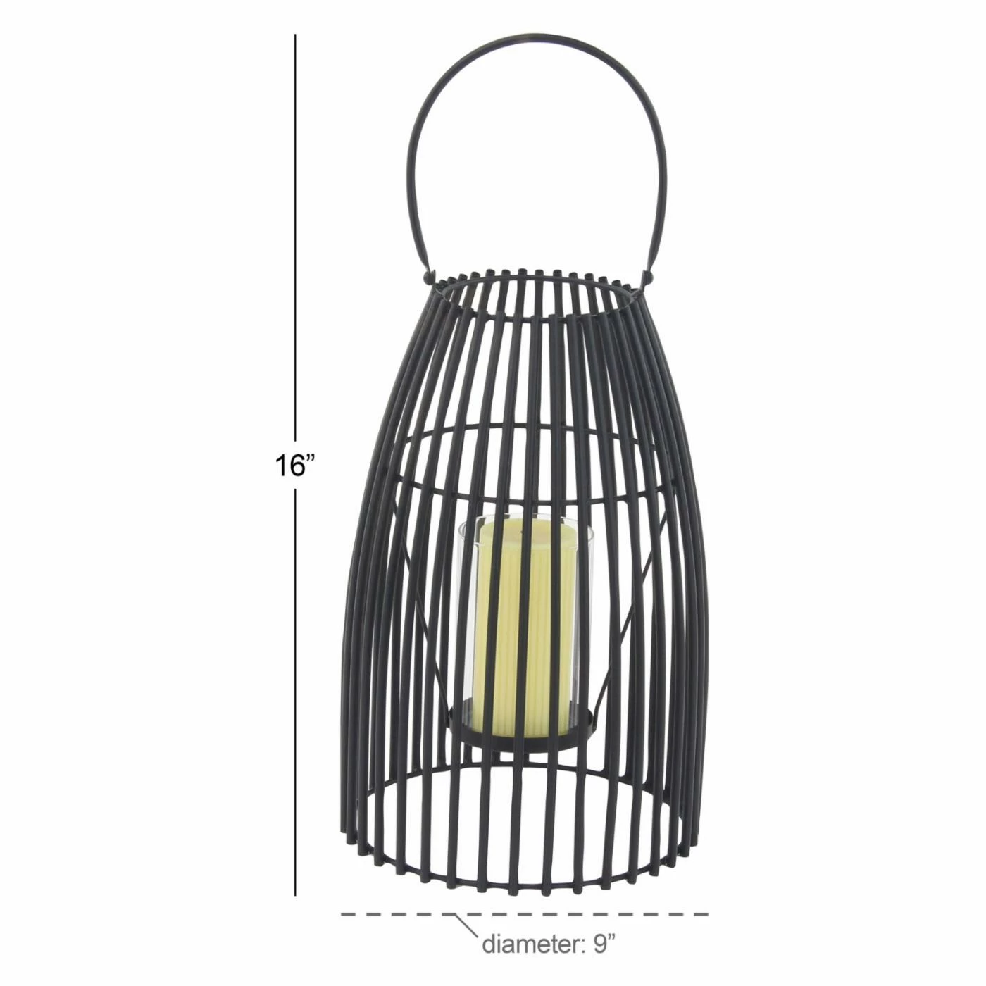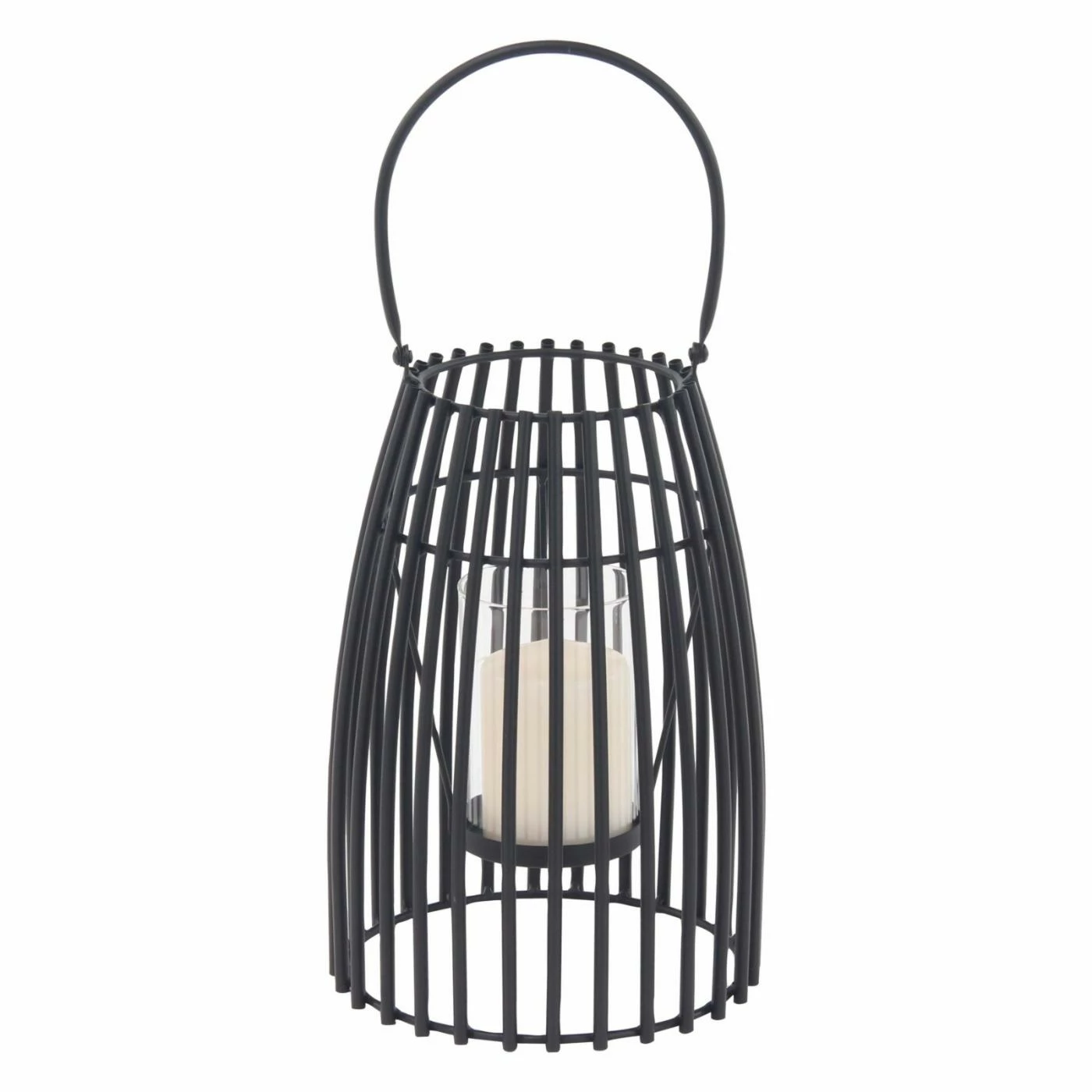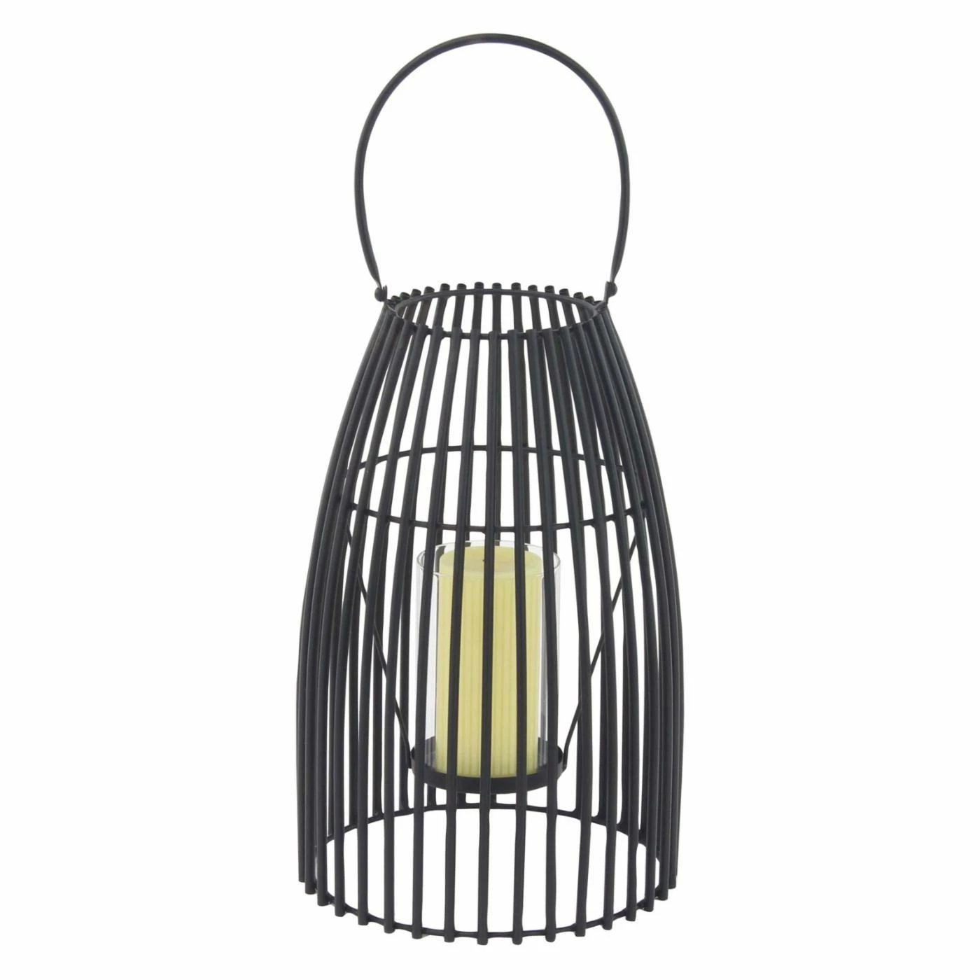 Simple iron slats and an understated arched handle give the DecMode Iron and Glass Decorative Caged Black Lantern a minimalist look. The heavy-duty iron lantern comes with a clear glass cup that encloses your candle for a safer burn.