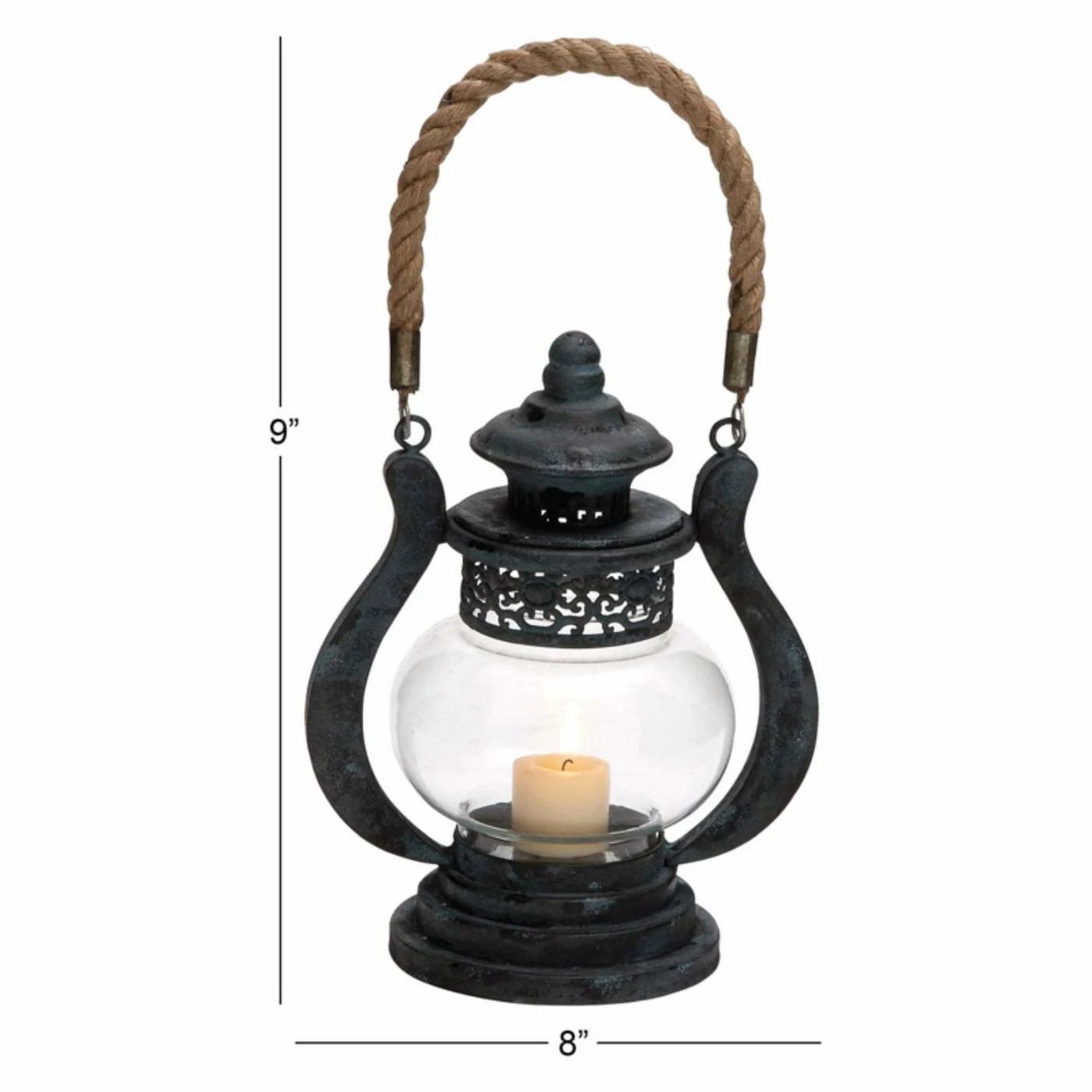 Blending Old World and modern industrial design elements, the DecMode Lantern Candle Holder with Rope Handle – Black is a versatile decorative accent that can look at home in any living space. Its curvaceous frame features a distressed black finish that can coordinate with any color palette. The filigree crown lifts off for easy access to the candle stand, which is surrounded by a clear glass shade. A thick braided jute rope handle with rusted metal end caps finishes the design.