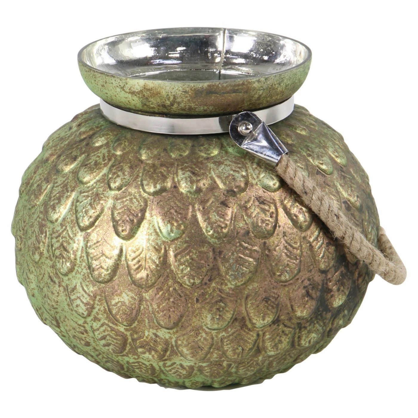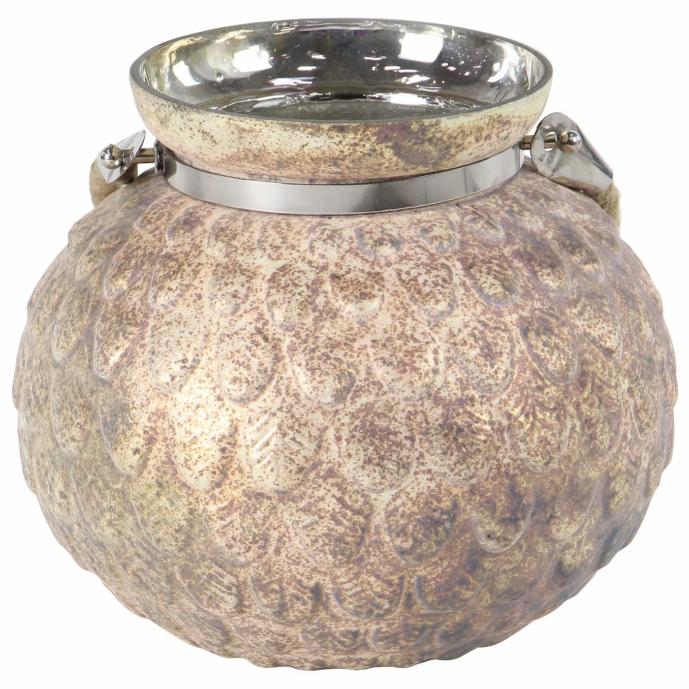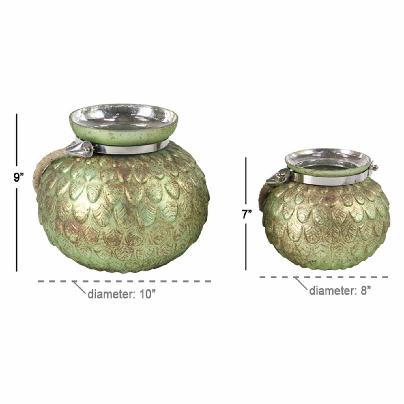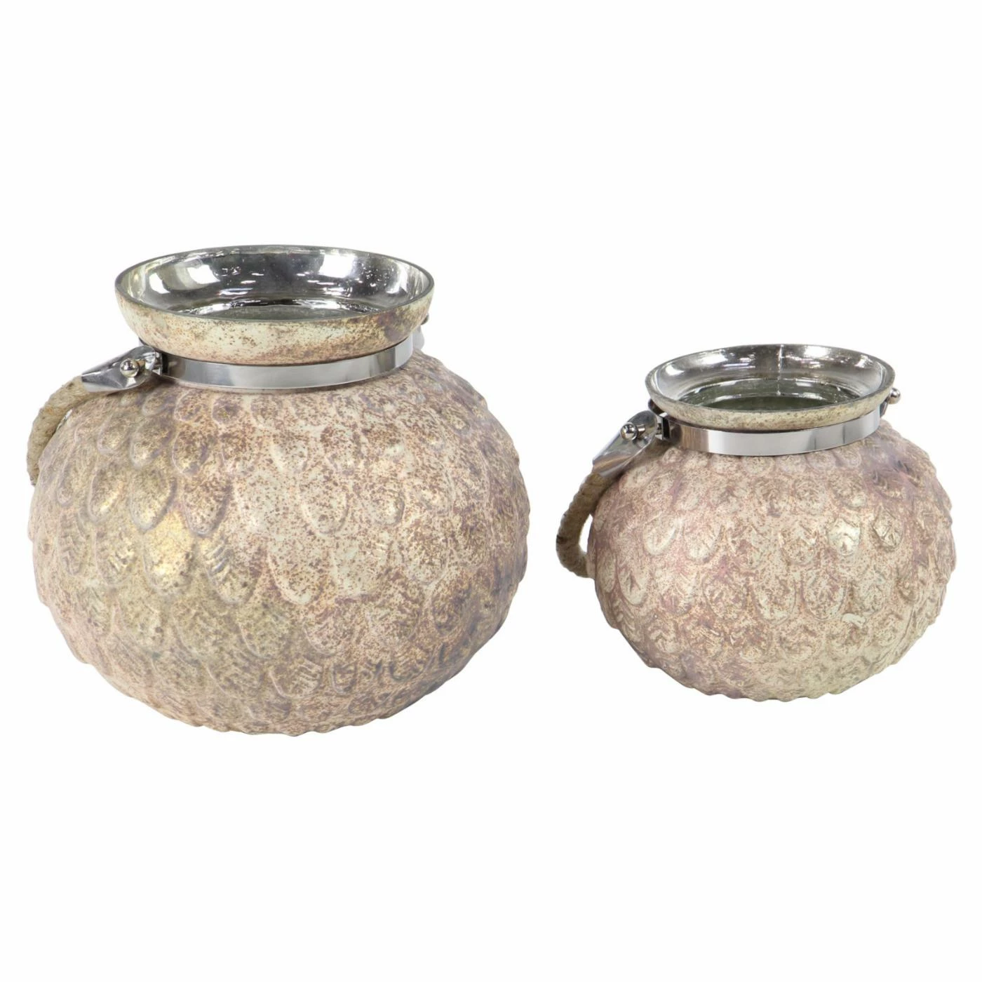 Raised feather detailing and rustic jute handles give the DecMode Metal Feather Tea Light Holders – Set of 2 its casual coastal appeal. The set includes a seven-inch and nine-inch tall candle holder; each measures ten inches around. They’re offered in your choice of available finish and designed to hold tea light candles (not included).