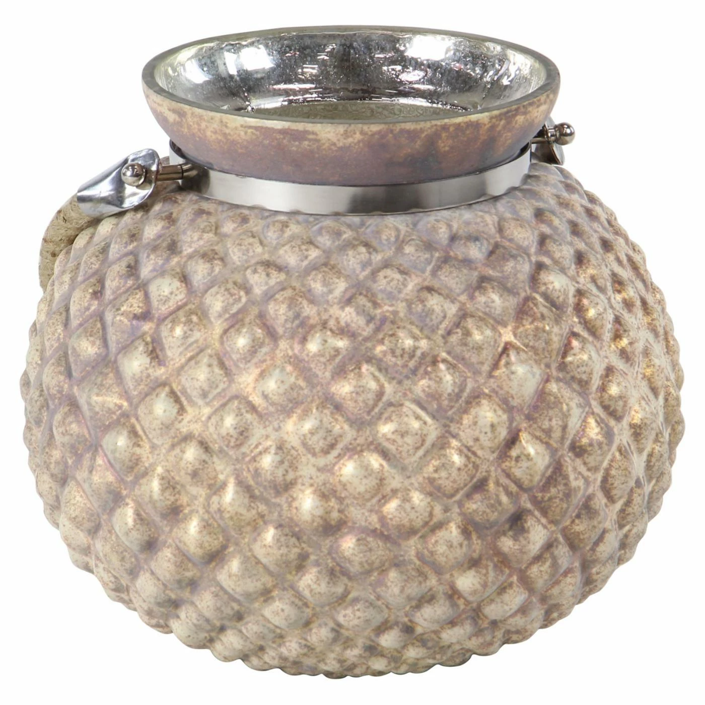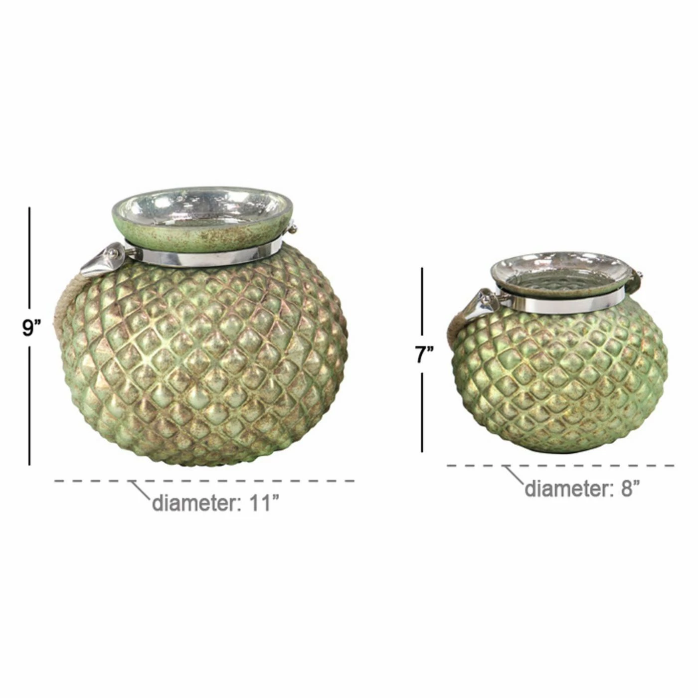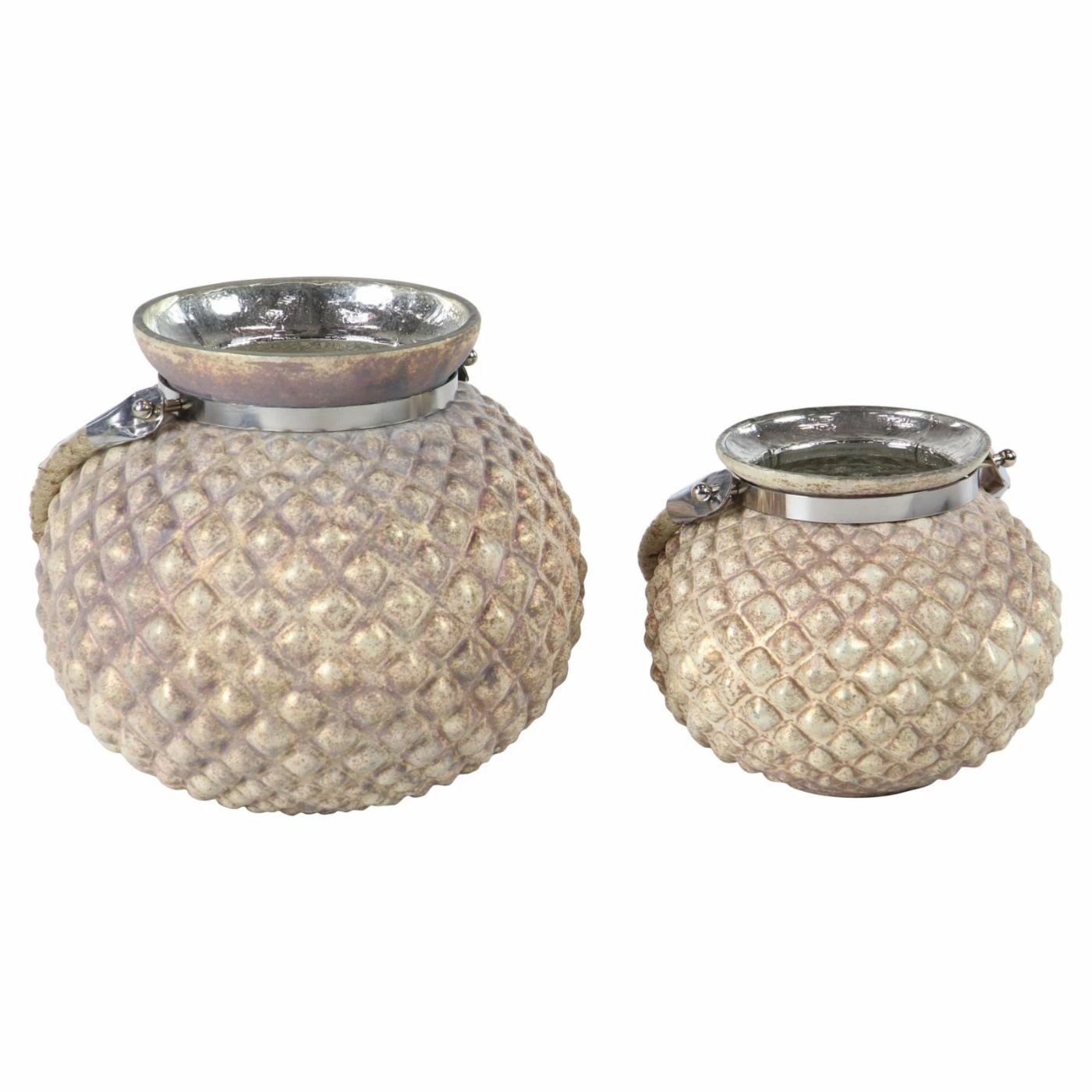 Raised diamonds add texture to the DecMode Metal Scales Tea Light Holders – Set of 2. Your choice of available finish option ensures this candle holder set will work beautifully with your dรฉcor. Each holds one tea light candle (sold separately) and includes a rustic jute rope handle. The set includes a seven-inch and nine-inch tall holder; each measures ten inches in diameter.