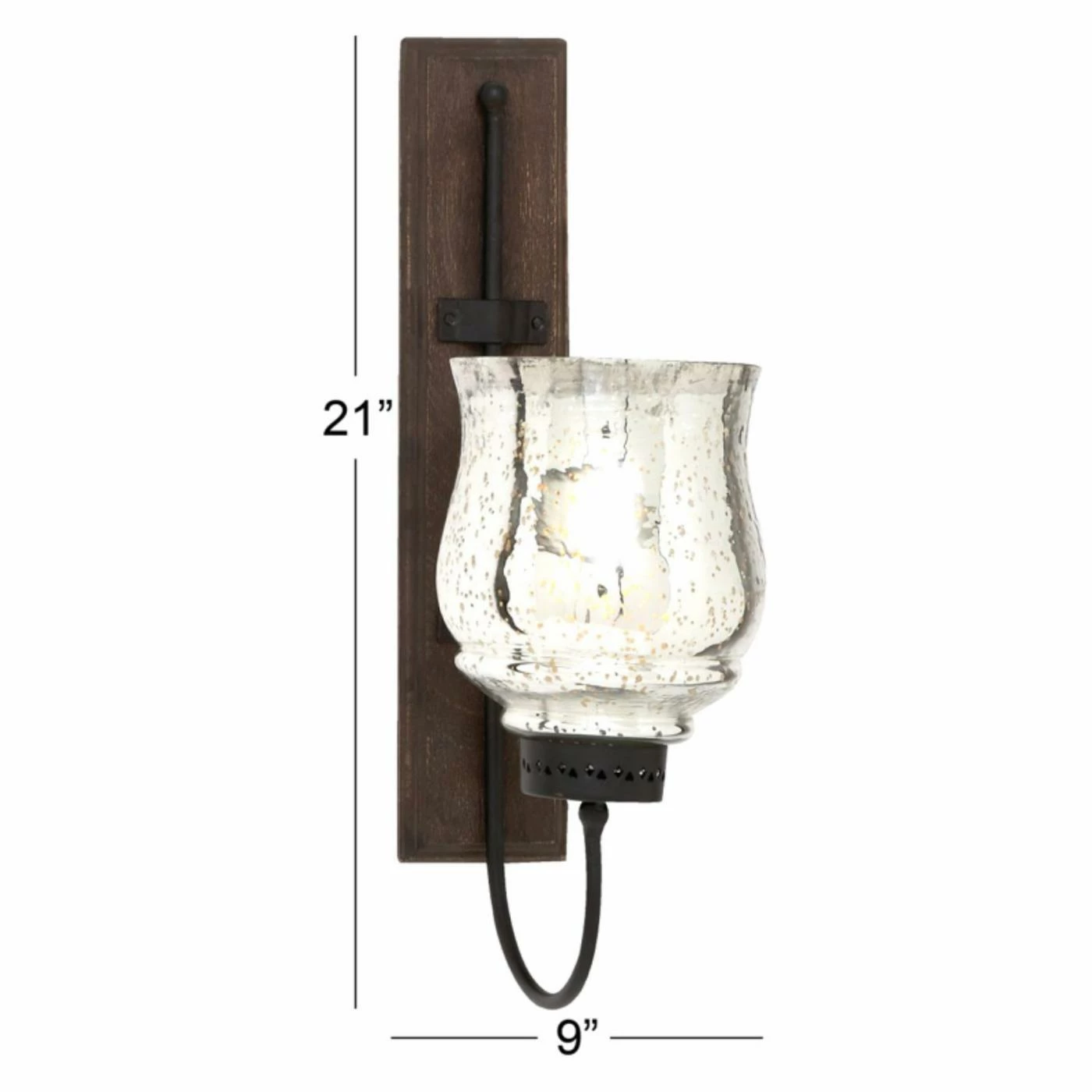 This DecMode Square Bracket Metal and Mercury Glass Wall Sconce adds a decorative flourish to your walls. This candle sconce features a walnut wood frame and iron bracket for a rustic look. It comes with a faux mercury glass lamp that holds one candle.