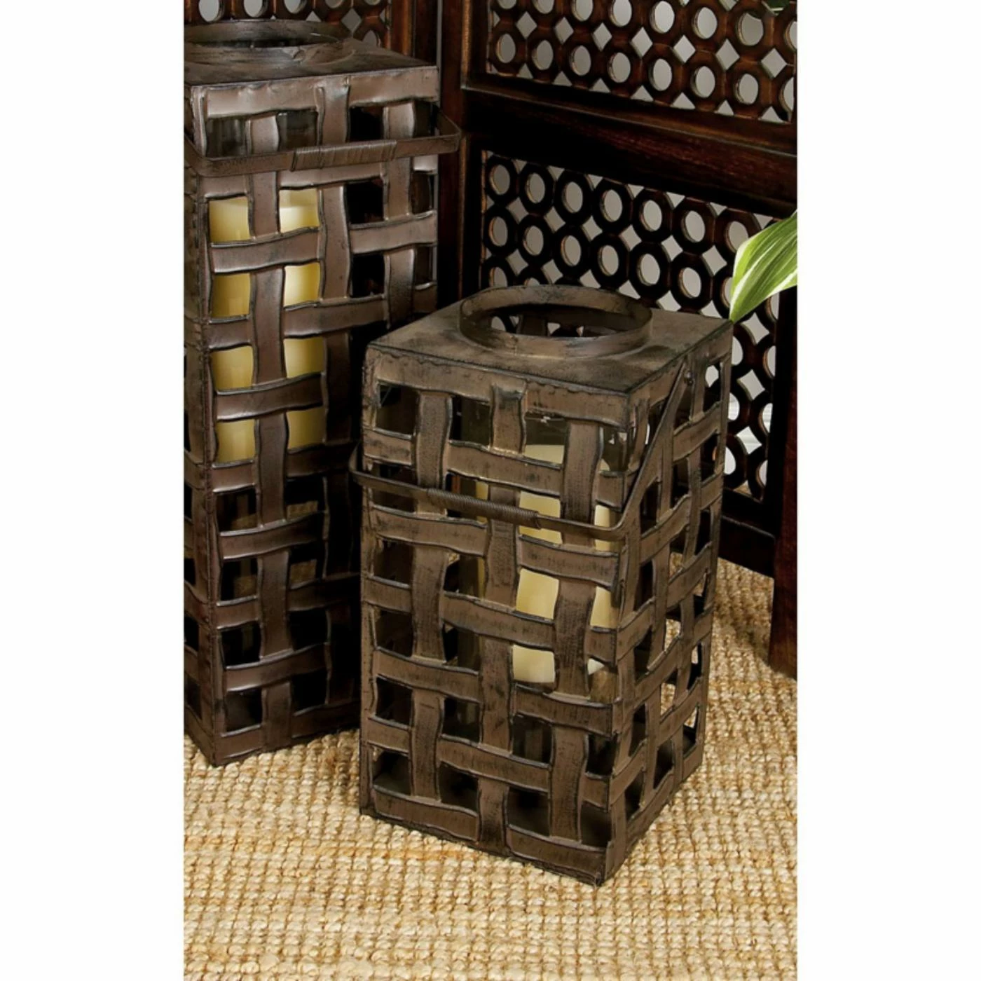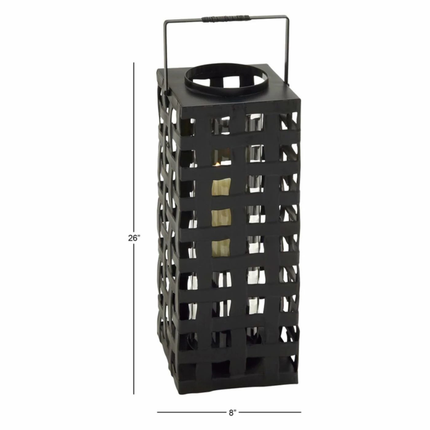The DecMode Square Lattice Metal and Glass Candle Lantern adds soft lighting in modern style. Made of all-weather iron, this lantern features a solid bottom and an open weave design for an intriguing silhouette. A vertical glass cylinder sits inside and holds one candle.