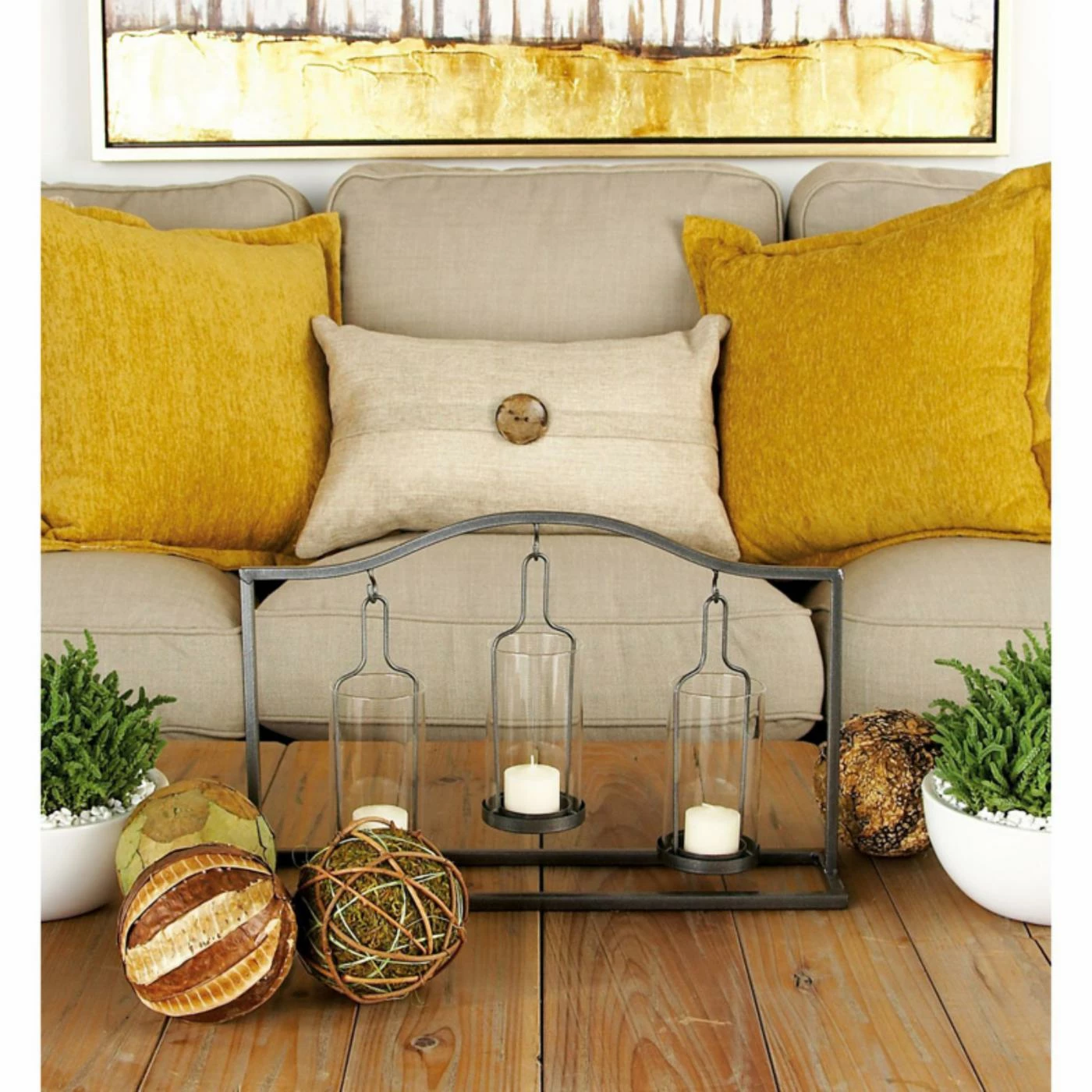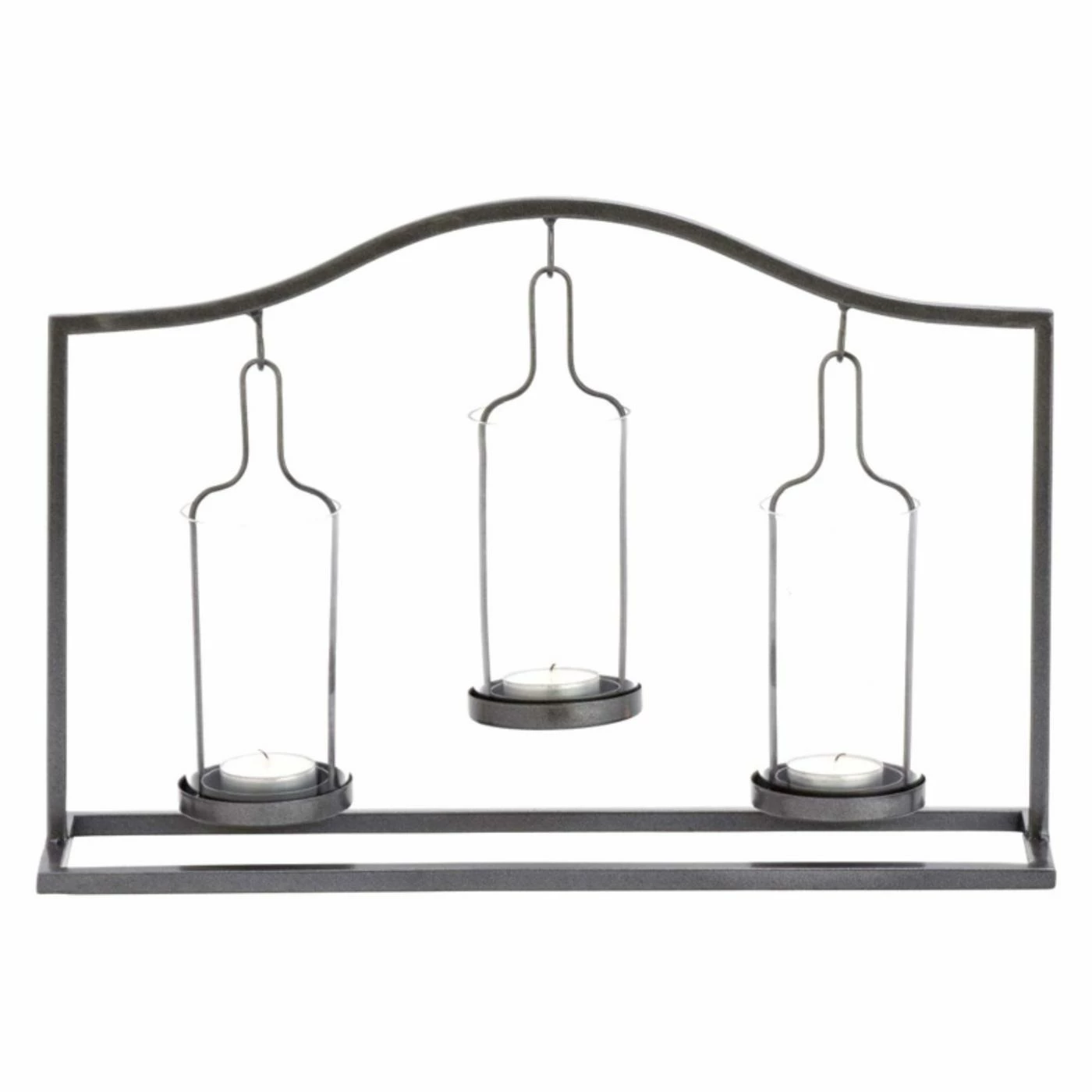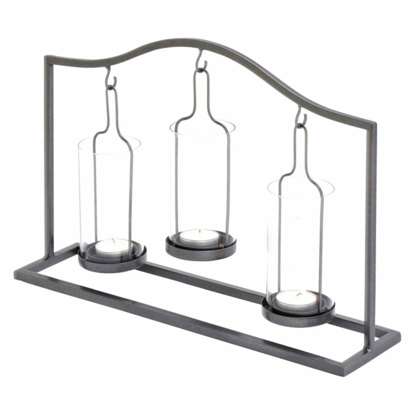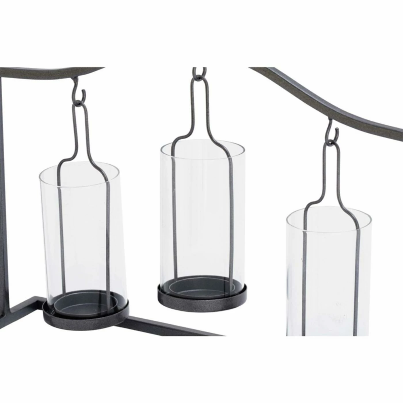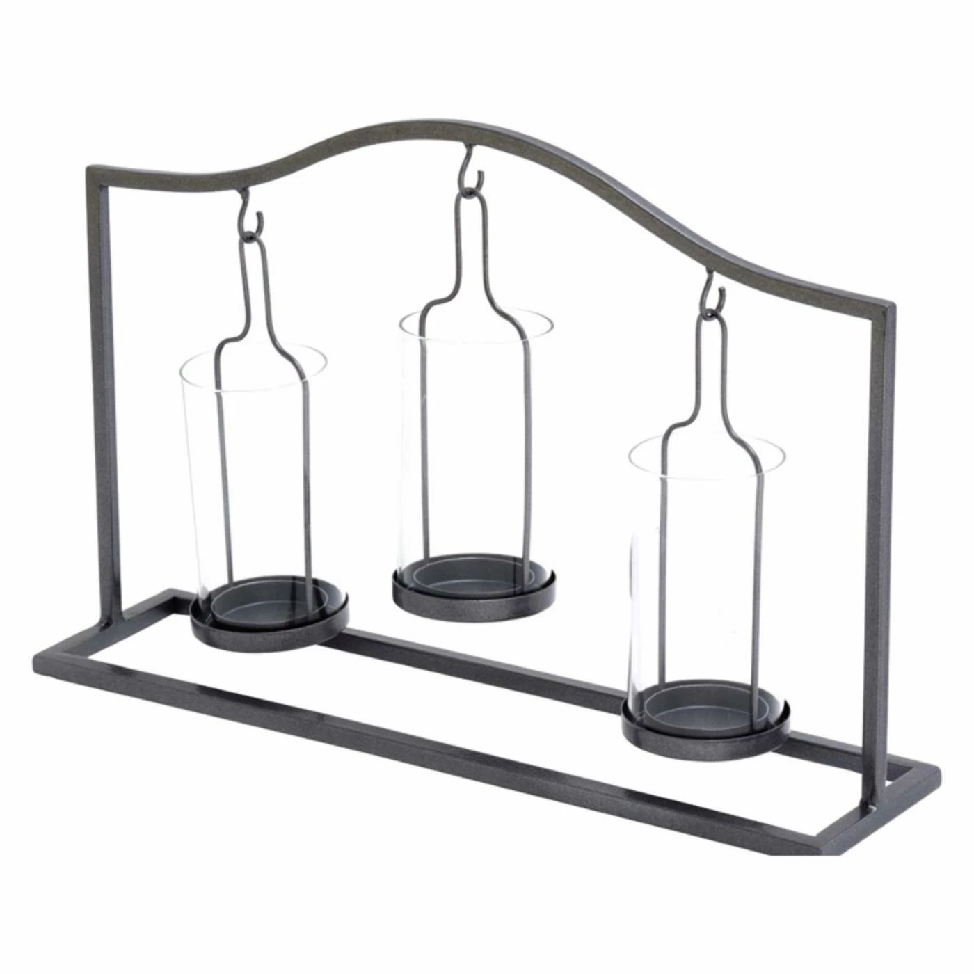 Dress up any room in industrial-modern style with the DecMode Votive Candle Holder – Metallic Black. This unique piece of dΓ©cor has a durable iron frame finished in a sleek metallic black. Three matching pedestals hang from the center, while a clear glass hurricane shade surrounds each one, so you can add your favorite votive candles in dramatic fashion.
