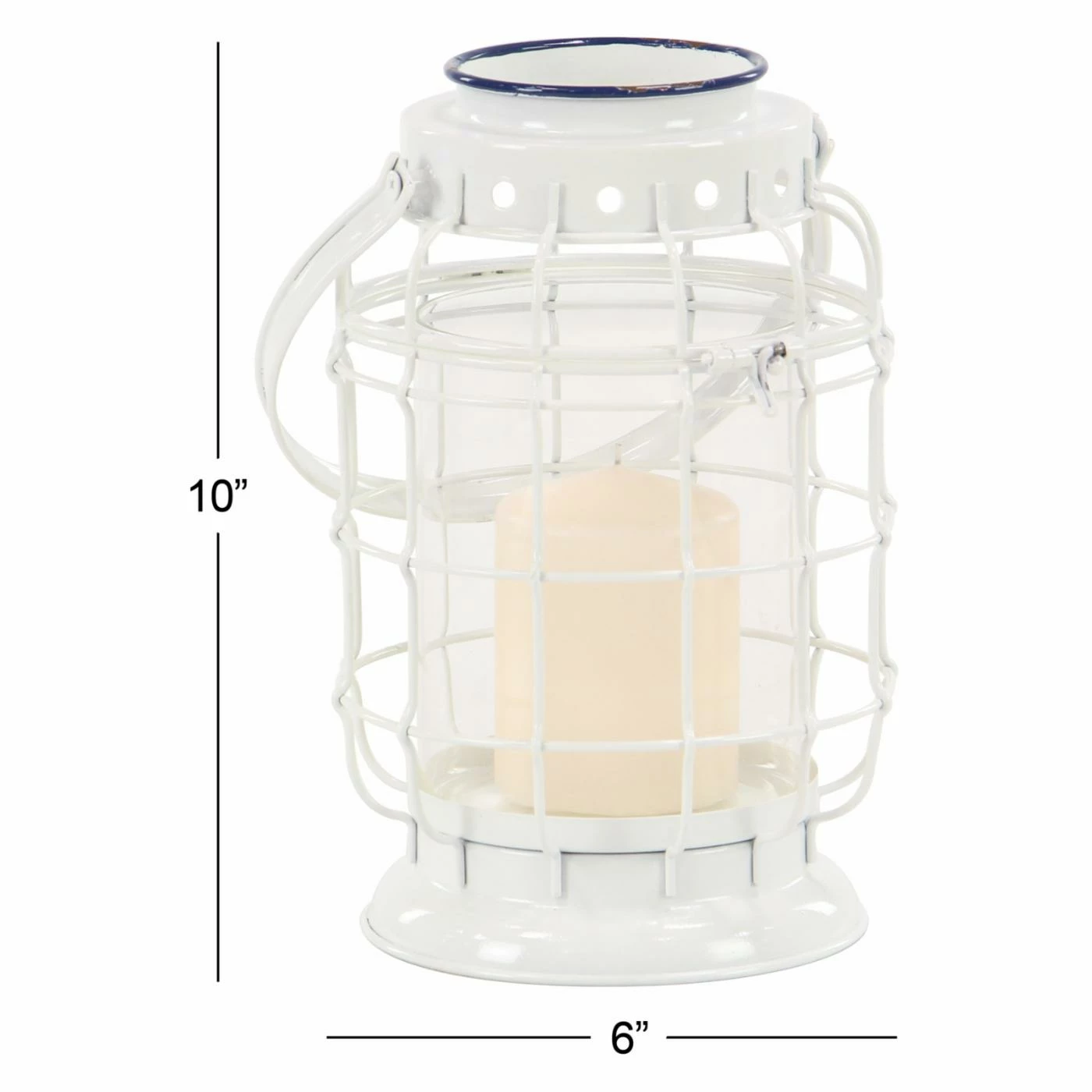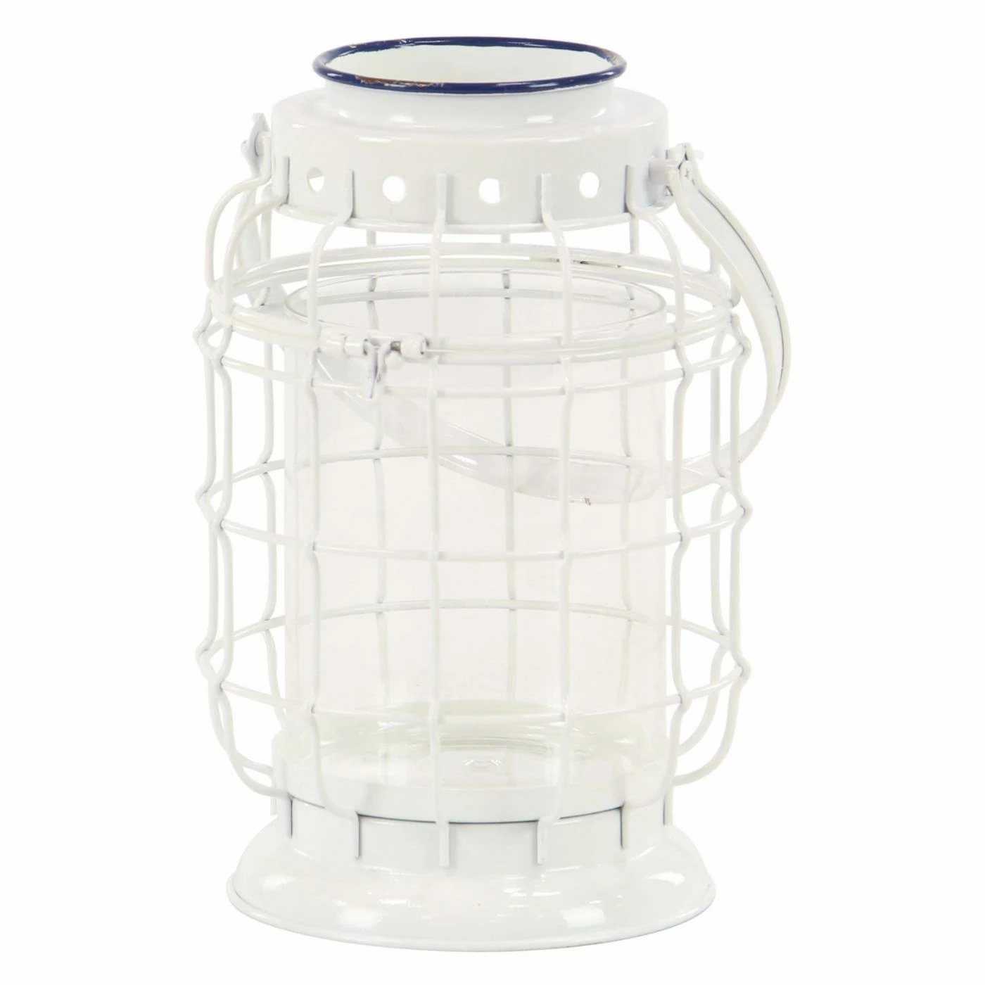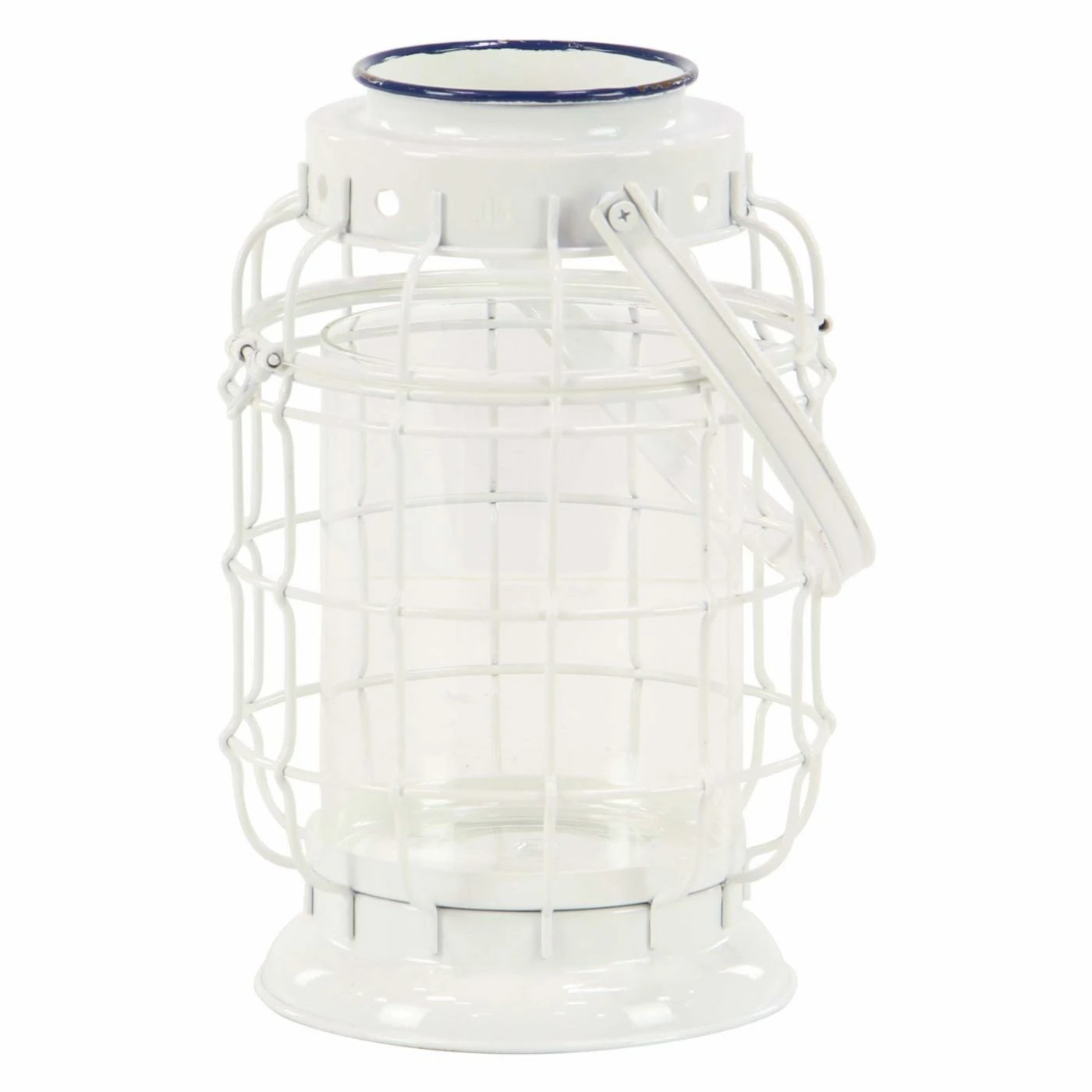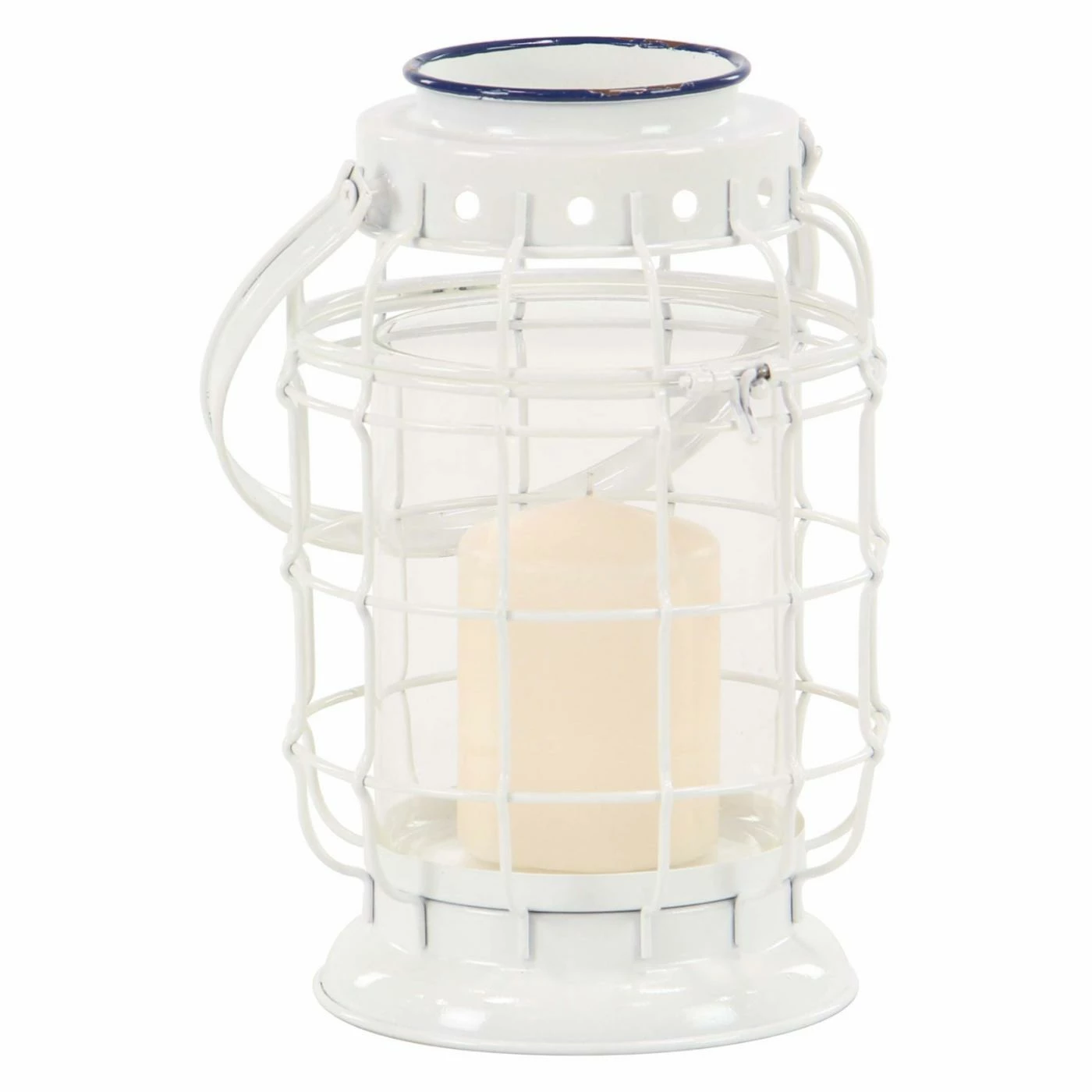 With its white and navy blue finish, the DecMode White Iron Square Weave Candle Lantern adds a coastal touch to interiors. The heavy-duty metal lantern has a handle for hanging or can be placed flat on a table or shelf. A clear glass shade surrounds your pillar candle for a safer, brighter burn.