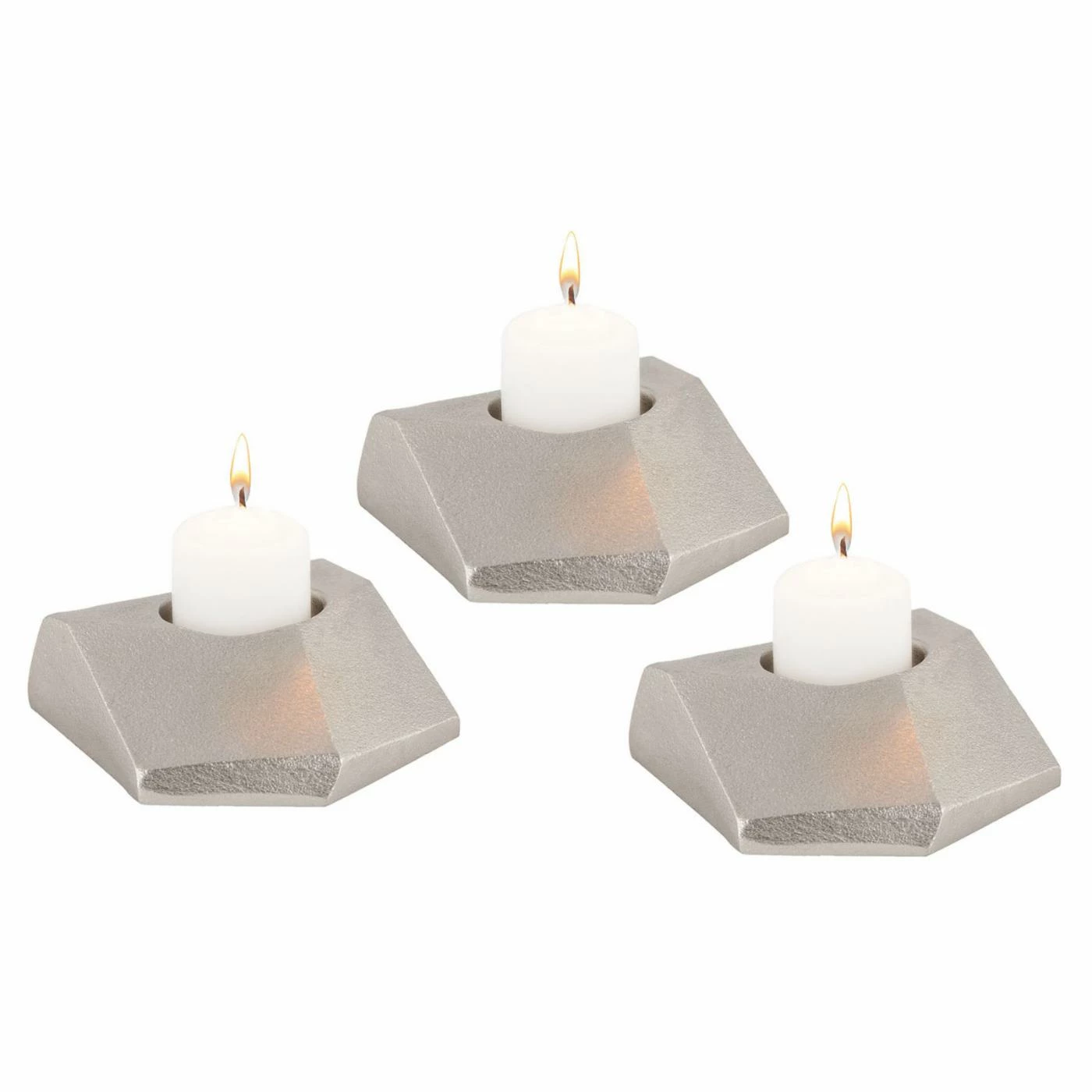 The ELK Lighting Trope Tea Light Candle Holders – Set of 3 provides you with a set of three matching candle holders, an ideal focal point for your modern or transitional-style setting. Each of these candle holders is made from durable metal. The surfaces are faceted to give the appearance of roughly hewn rock and come finished in a dual-tone nickel-plated color. Designed for use with votive or tealights. Candles not included.