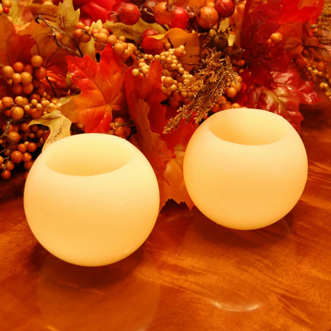 Realistically crafted from wax, the LumaBase 4 in. Ball Battery Operated LED Candles – Set of 2 create a safe and cozy glow wherever you put them. Featuring LED lights for illumination, these battery-operated, ball-shaped candles flicker from within and conveniently turn off with an eight-hour timer. Batteries not included.