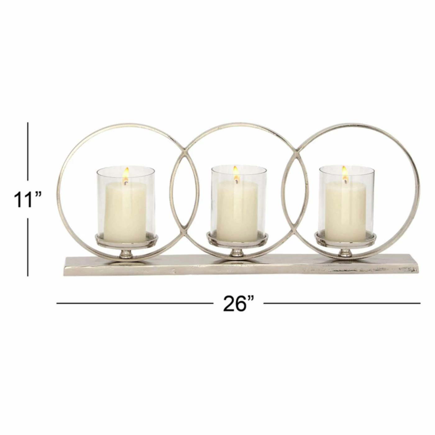 Finish off your modern dΓ©cor with the sleek shine of silver-finished metal and glass, compliments of the DecMode 11-in. Glass Candle Holder. Intended for votive candles, the holder features ring accents around each of its clear glass cups and pedestal bobeches, and it’s completed by a simple rectangular base. The aluminum metal will remain shiny with age due to its natural anti-tarnish properties.