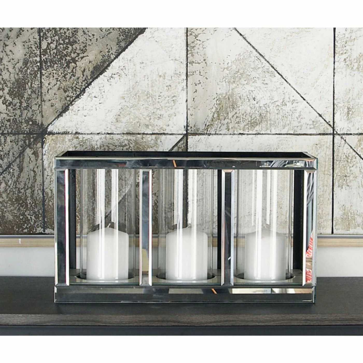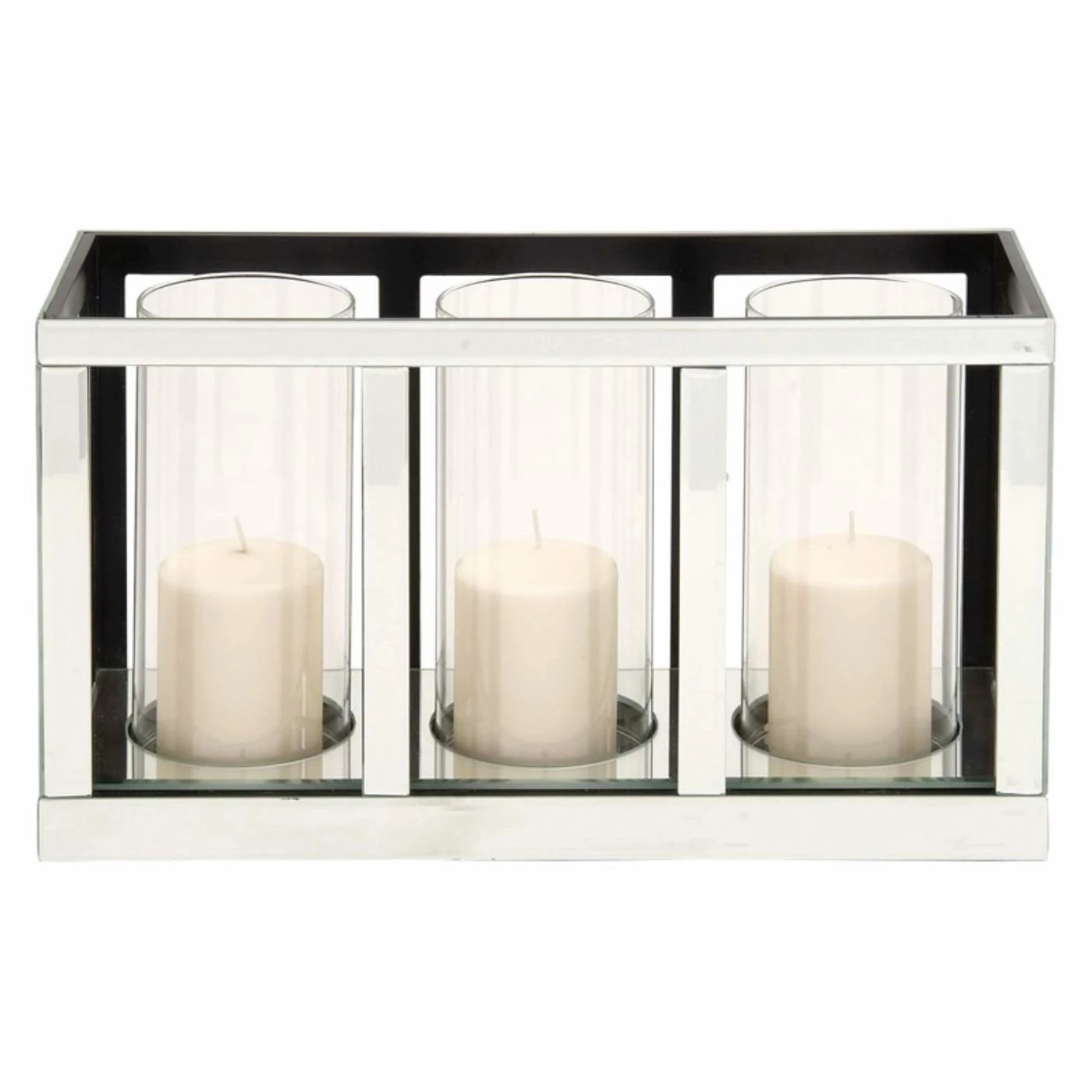 Get creative with your dΓ©cor when you display the DecMode 18 in. Candle Holder featuring a fascinating design bolstered by a shiny mirrored frame. This large candle holder supports three clear glass hurricane shades inside so you can add your chosen trio of candles. The bottom sections are completed with mirrors that help the light dance off the surface for a warm, inviting centerpiece.