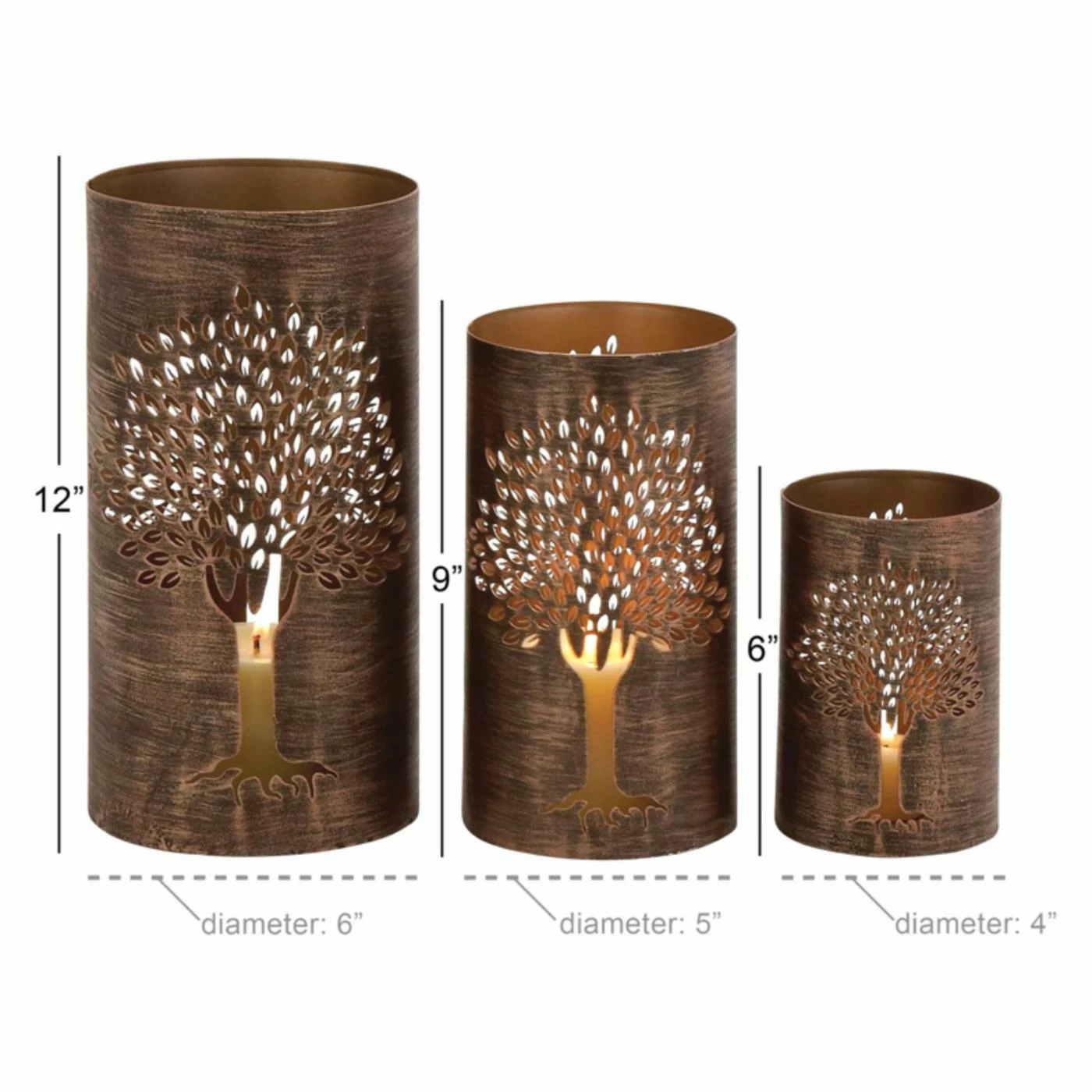 Intricately detailed tree-shaped cutouts give the DecMode 22096 Candle Holder – Set of 3 a unique illuminating presence. This distressed bronze, cylindrical trio brings warmth and beauty to your decor, even without a lit candle.