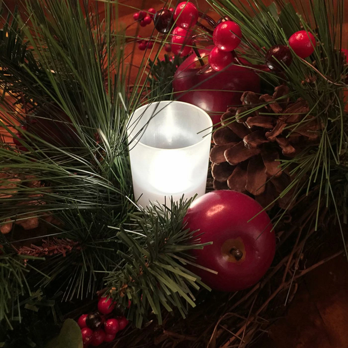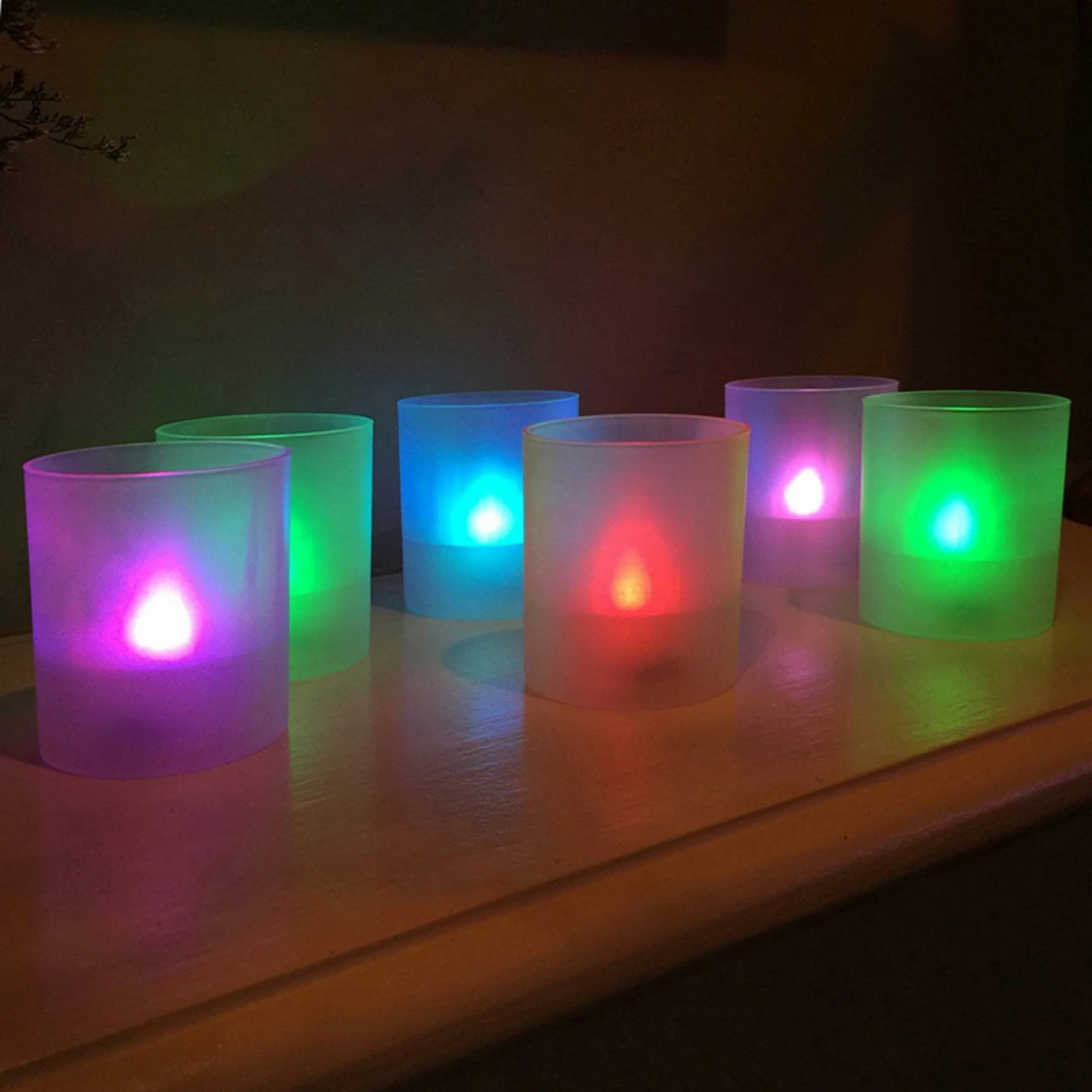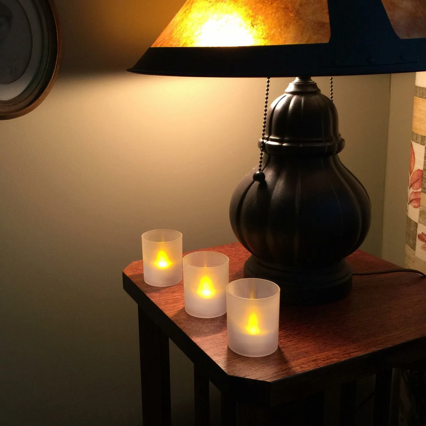 Safely create a cozy glow wherever you want with the LumaBase Flameless Votive Candles in Frosted Holders – Set of 6. These battery-operated votives feature a plastic holder and a flickering LED candle that are the perfect size for placement in any room. Featuring a five-hour timer, these votives turn themselves off automatically for worry-free illumination anytime and anywhere. Batteries not included.