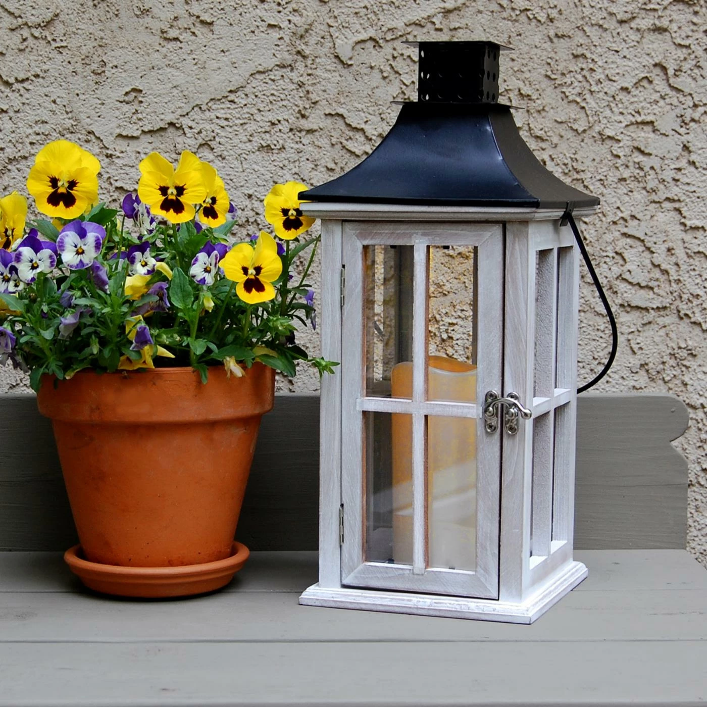Enhance your home with the charming and cozy appeal of the LumaBase White Wooden Lantern with LED Candle. Beautifully crafted from wood with a metal roof, this lantern brightens your space instantly. This lantern includes a battery-operated, LED-lit, flickering candle that features a convenient timer that automatically comes on and goes off all on its own. Complete with a distressed white finish, this lantern features a loop handled top for hanging. Batteries not included.