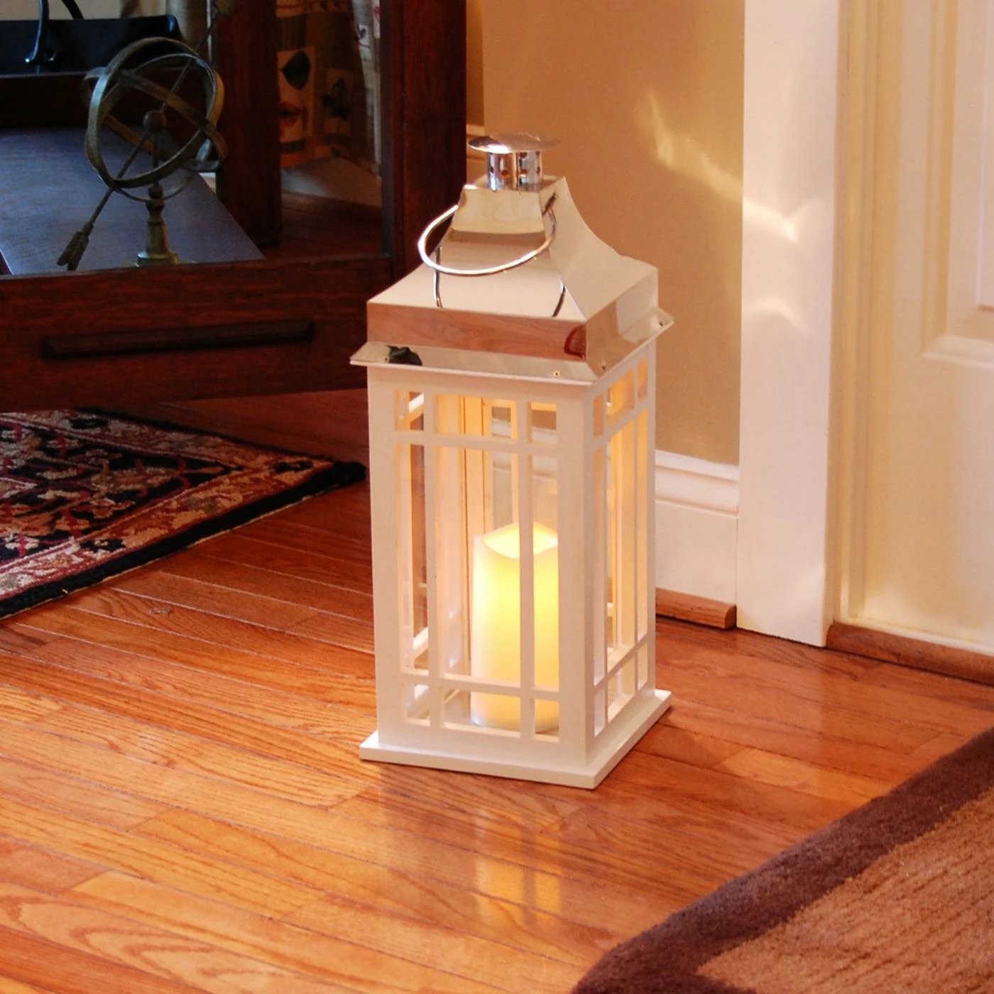 Enhance your home with the charming and cozy appeal of the LumaBase Wooden Lantern with LED Candle. Beautifully crafted from wood with a metal roof, this lantern brightens your space instantly. This lantern includes a battery-operated, LED-lit, flickering candle that features a convenient timer that automatically comes on and goes off all on its own. Available in your choice of color, this lantern features a loop handled top for hanging. Batteries not included.