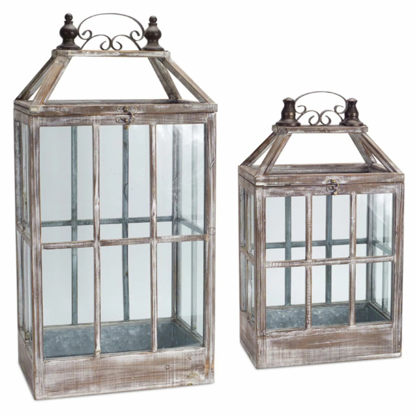 Created in a charming birdcage-inspired design, the Melrose International 70491 Lantern – Set of 2 brings vintage appeal to your abode. This sweet set of two lanterns feature a wood frame in a brown and white finish with clear glass panes and decorative metal details on the hinged, latched top.