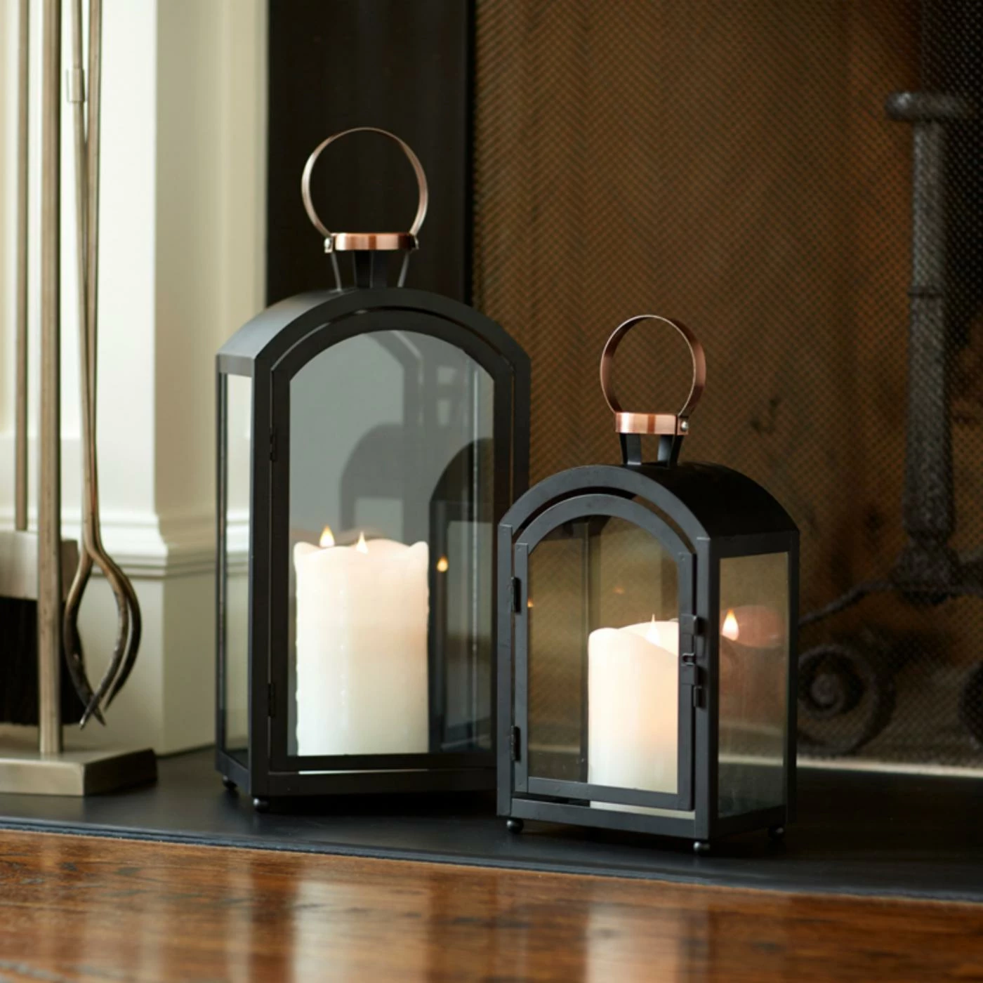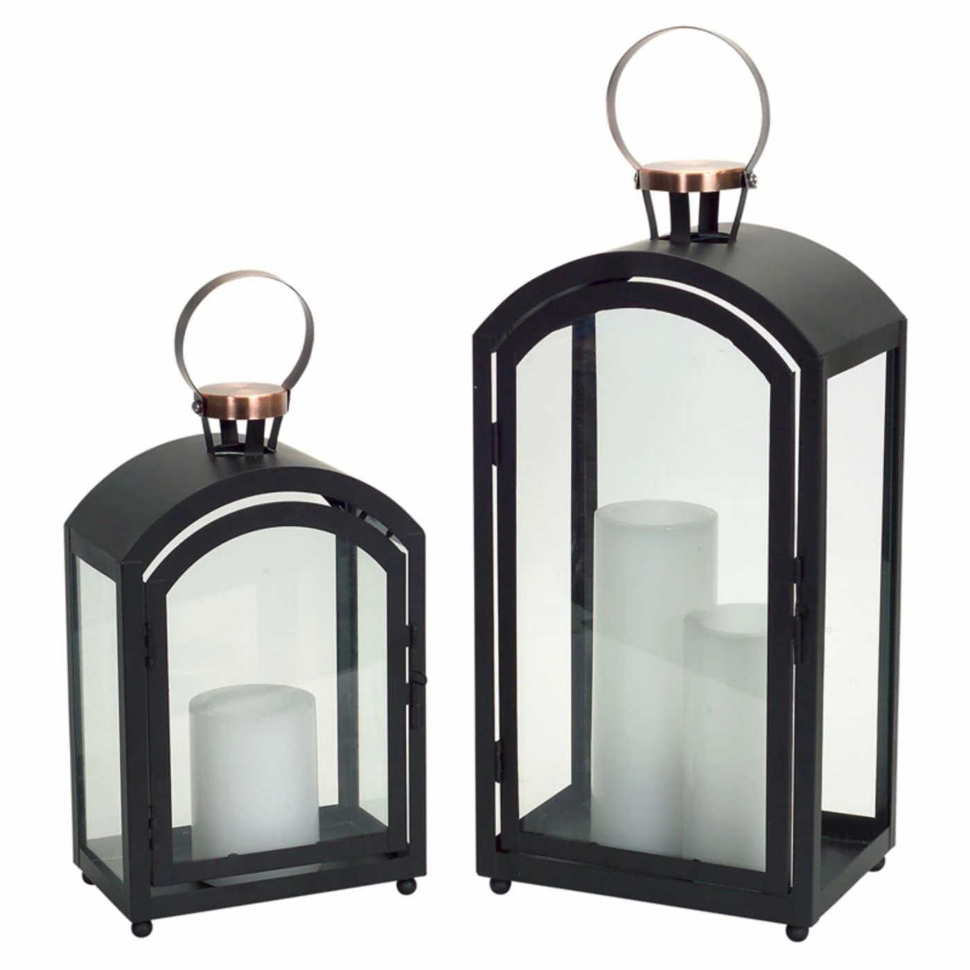 The Melrose International Rounded Lantern – Set of 2 has arched tops and unique ball feet on the bottom for added whimsy. The bold black finish contrasts beautifully with the shimmering copper tops to create a visually dramatic pair of elegant lanterns you can easily integrate into your modern dΓ©cor.