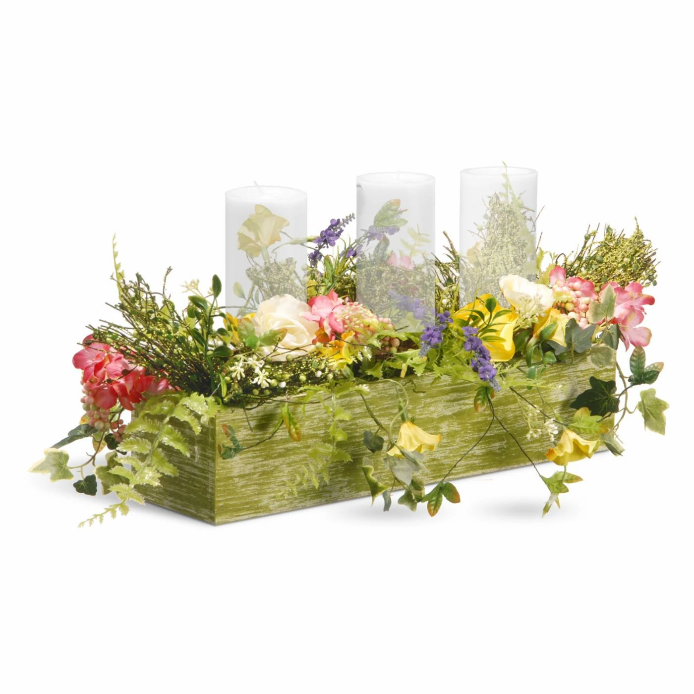 The National Tree Company Hurricane Candle Holder is going to put that charming, farmhouse chic right at the center of any table. A trio of hurricane candle shades of clear glass stands on metal trays. The trays are set deep in a wooden box that’s bursting with faux greenery. The painted finish of the box has the look of weathered woodgrain that’s consistent with the rustic style. A mix of flowers, leaves, and greenery leans over the edges and wraps around the hurricane candles.