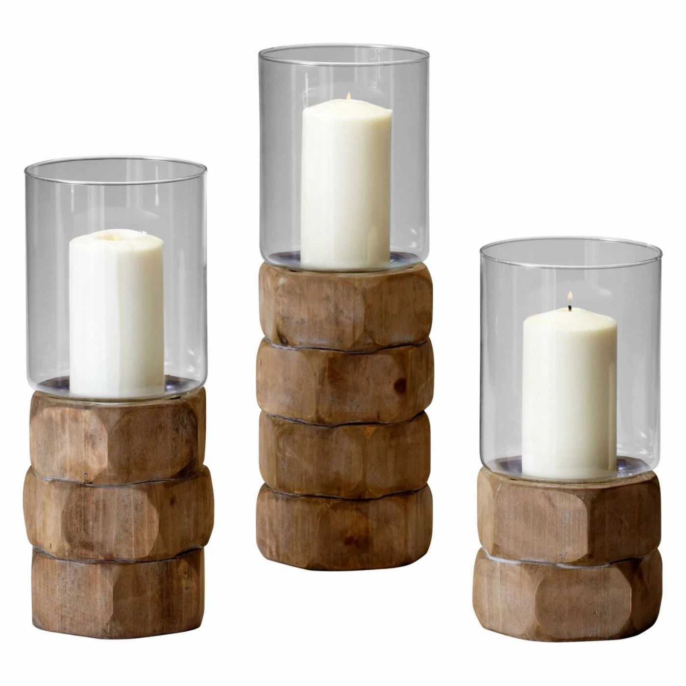 A stacked hexagon design brings incredible dimension to the Cyan Design Hex Nut Candleholder. This rustic yet contemporary candleholder offers a cylinder glass shade on the top. This candleholder is completed with a natural wood finish.