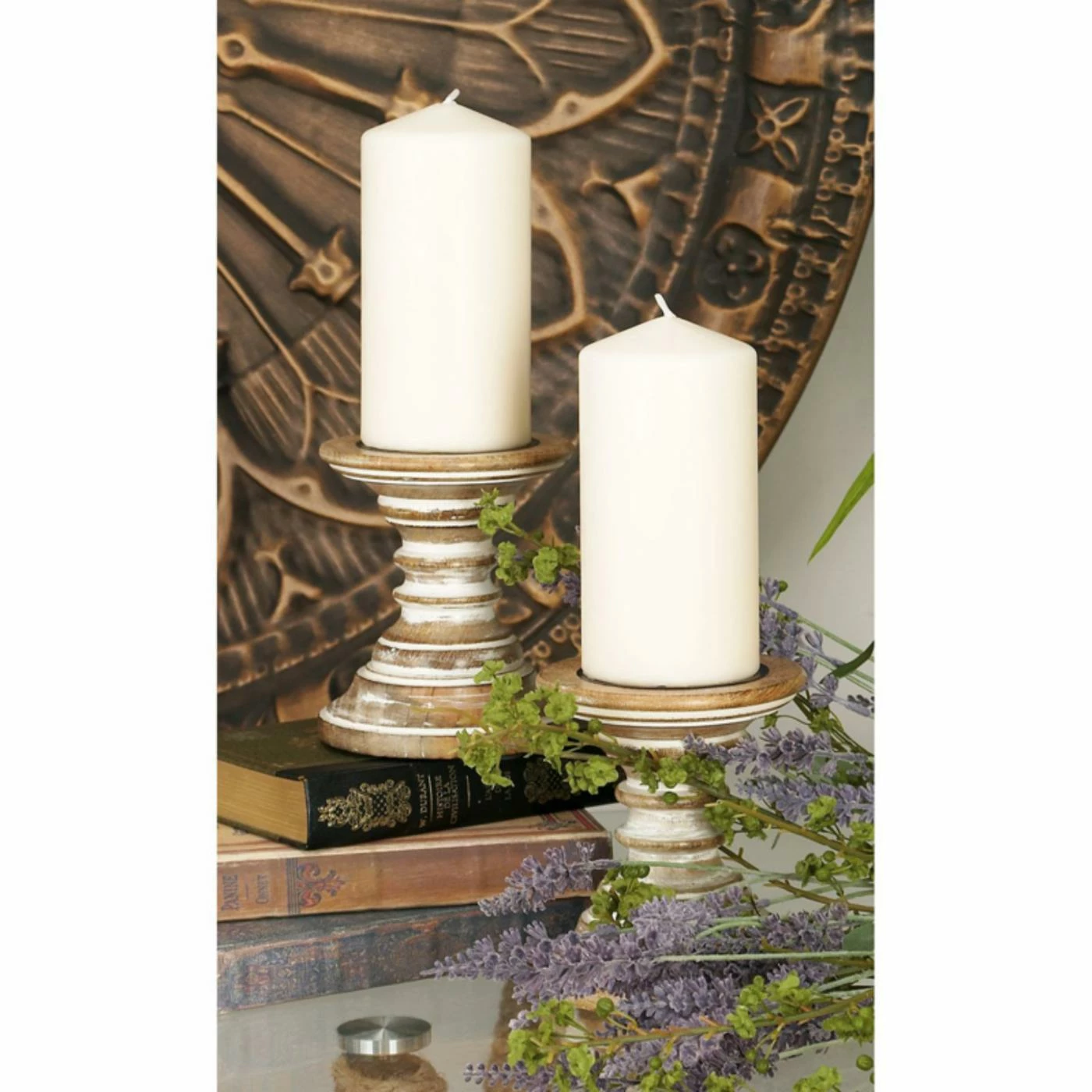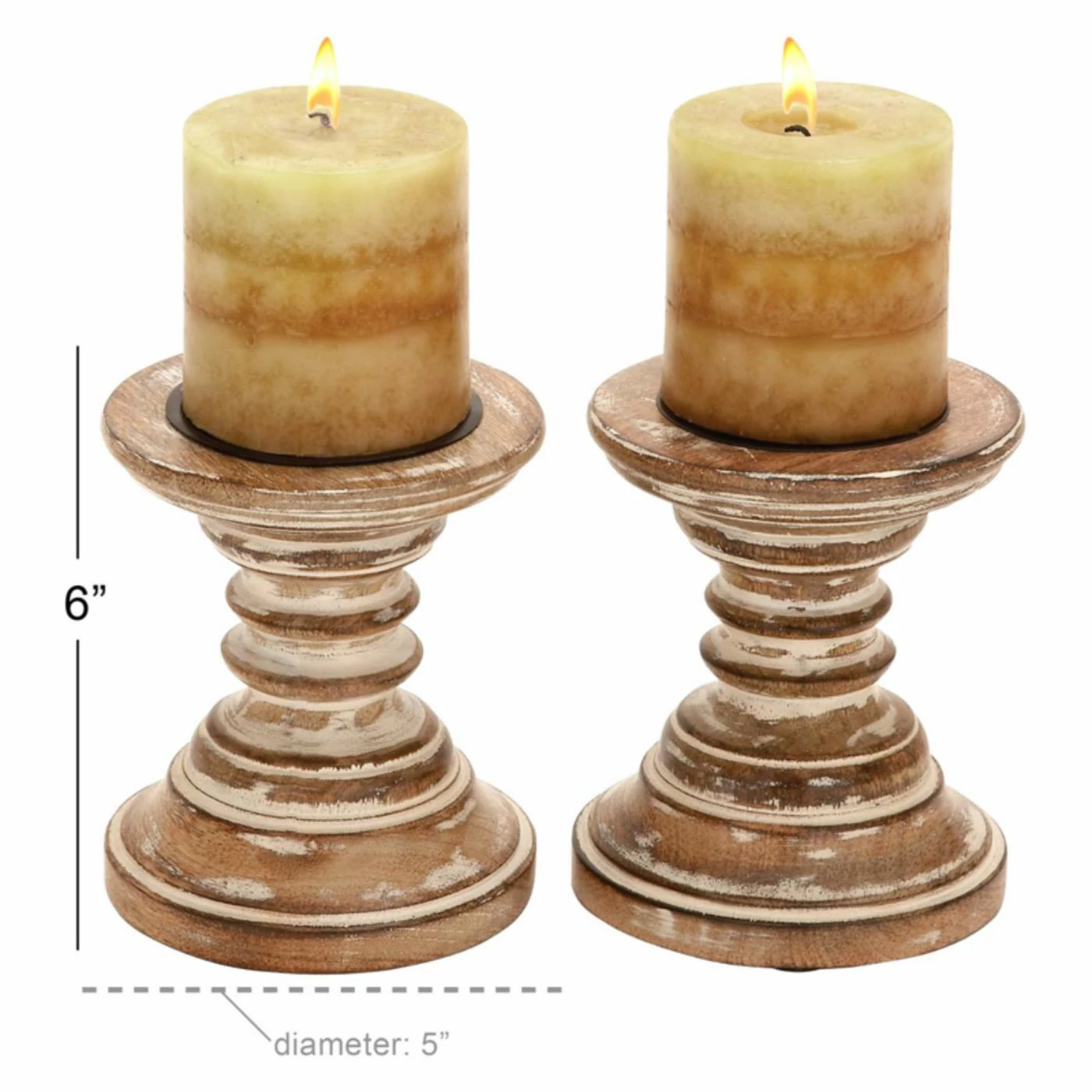 The spindle-style DecMode 6-in. Round Turned Wood Candle Holder – Set of 2 is carved of mango wood and graced with a shabby-chic rubbed-through white finish. The set includes a pair of candle holders that stand six inches tall.