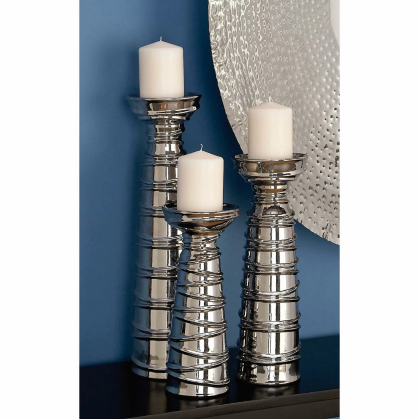A raised spiraling embellishment lends eye-catching texture and style to the DecMode 71691 Candle Holder – Set of 3. Highly polished in silver, this glowing set offers an illuminating presence to a table or shelf, with or without candles.