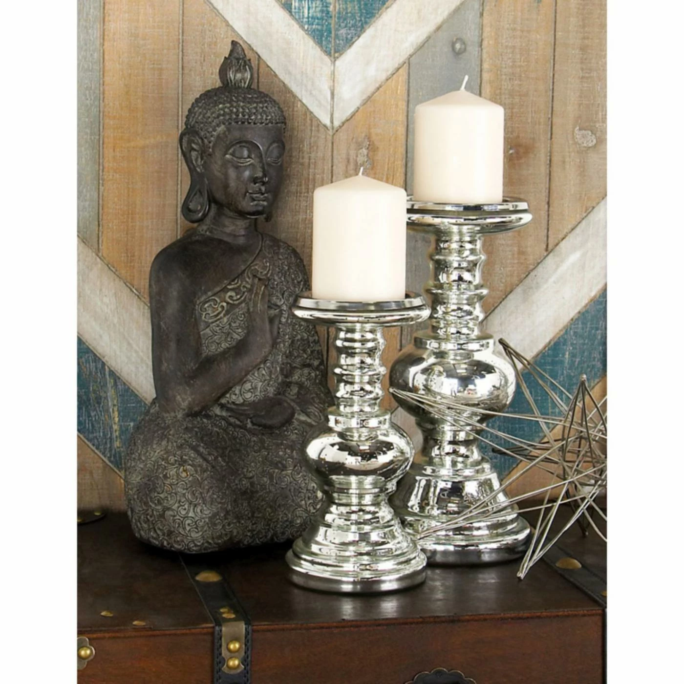 Enhance the look of your dining room, living room, or bedroom with the DecMode Glass Candle Holder – Set of 2. Fashioned out of glass, the turned pedestals have a splatter silver finish that gleams under the glow of your pillar candles. Iron bobeches secure the candles and catch dripping wax.