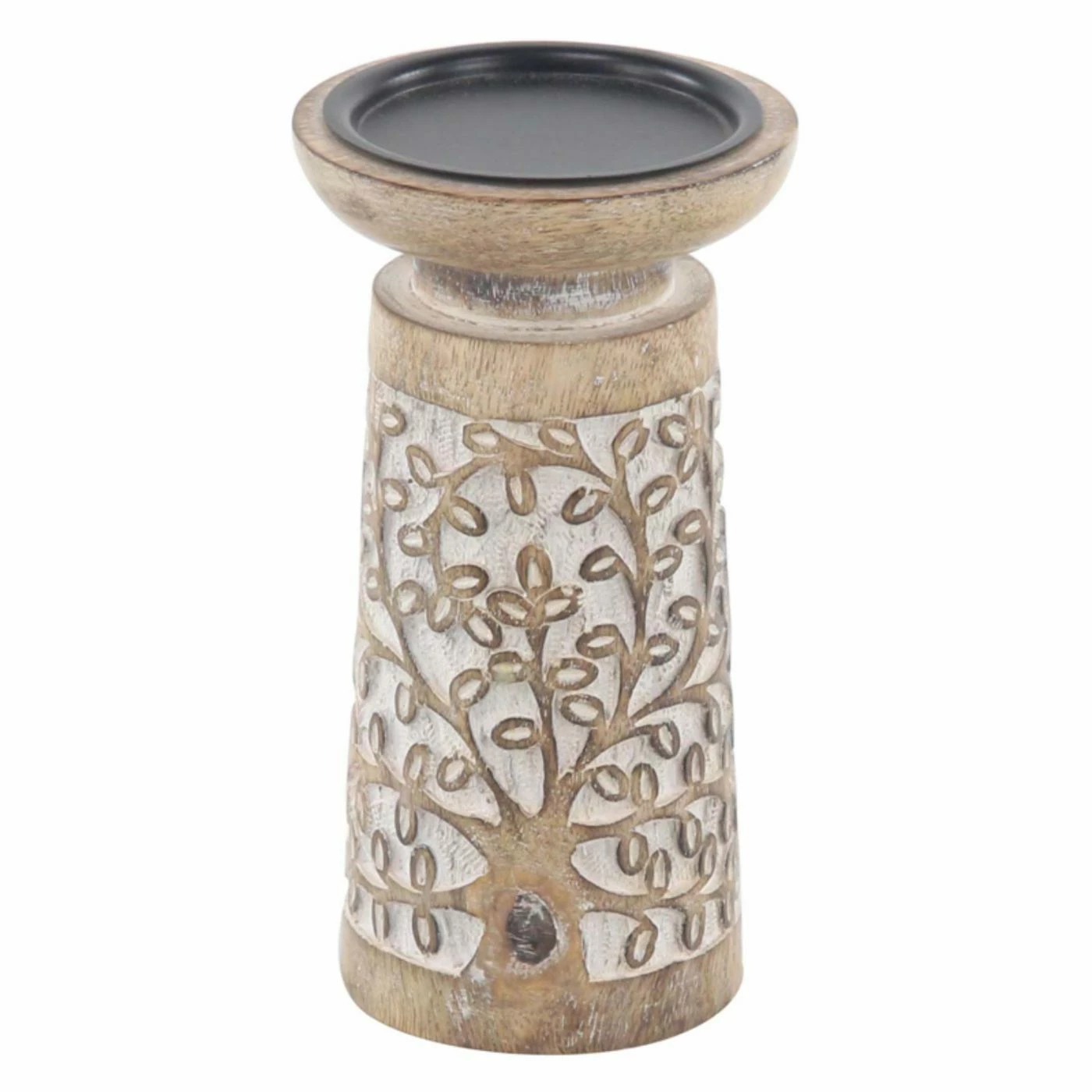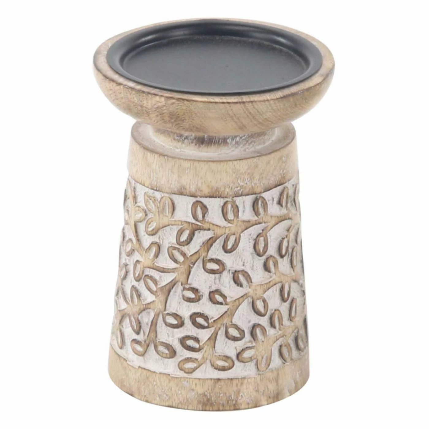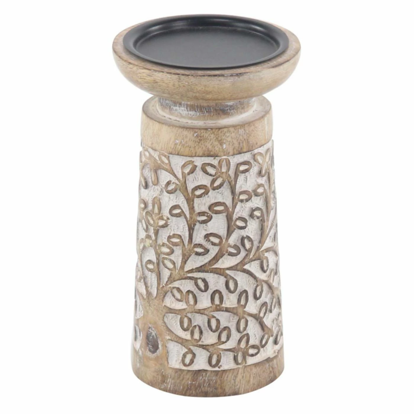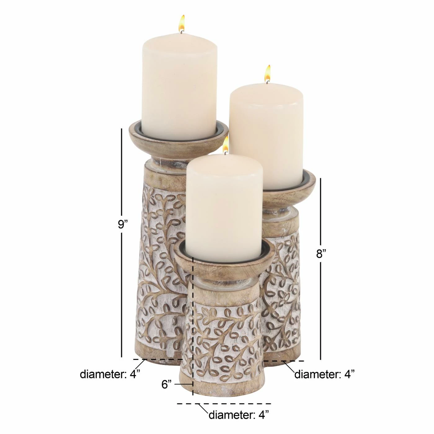 Complete your rustic dΓ©cor with the DecMode Rustic Mango Wood Flourish-Patterned Candle Holders – Set of 3. Deep floral vine carvings wrap around the tapered bases of the three candle holders, and the wood is whitewashed for an aged look.