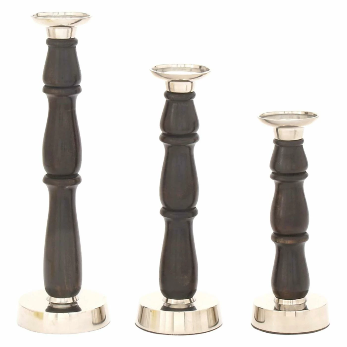Polished aluminum and turned mango wood posts in dark walnut make the DecMode Wood Aluminum Candle Holder – Set of 3 a distinctive way to decorate. The set includes three candle holders in graduated sizes.