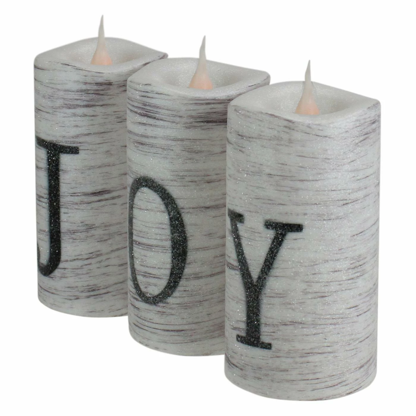 Enjoy flickering candlelight without the fire hazard when you add the Northlight LED Battery Operated JOY Christmas Candles – Set of 3 to your dΓ©cor, featuring three battery-operated pillar candles. This candle set features a birch tree finish accented with glitter, and each one features a black letter to spell out the word JOY for a festive aesthetic in your home.